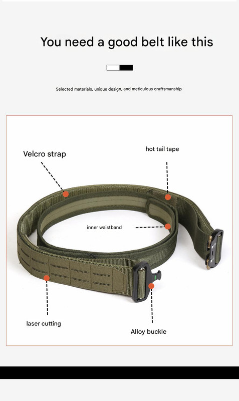 Experience superior performance and reliability with our innovative Dual Layer Quick Release Tactical Belt. This belt features a quick-release alloy Cobra-style buckle for one-touch unbuckling, offering convenience beyond imagination. Built with robust craftsmanship and quality assurance, it’s designed to be sturdy and durable, perfectly adapting to outdoor tactical operations, mountaineering, hiking, and more, providing you with reliable support. The construction includes an outer belt with a laser-cut attachment system for enhanced utility across various scenarios and a comfortable inner belt made from tough, wear-resistant nylon that can be adjusted in length. The belt body incorporates hook-and-loop fastening for secure attachment, and the tail end is heat-cut to prevent fraying.
