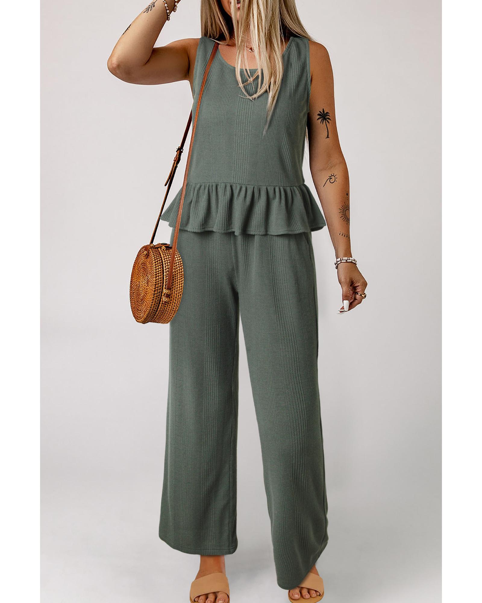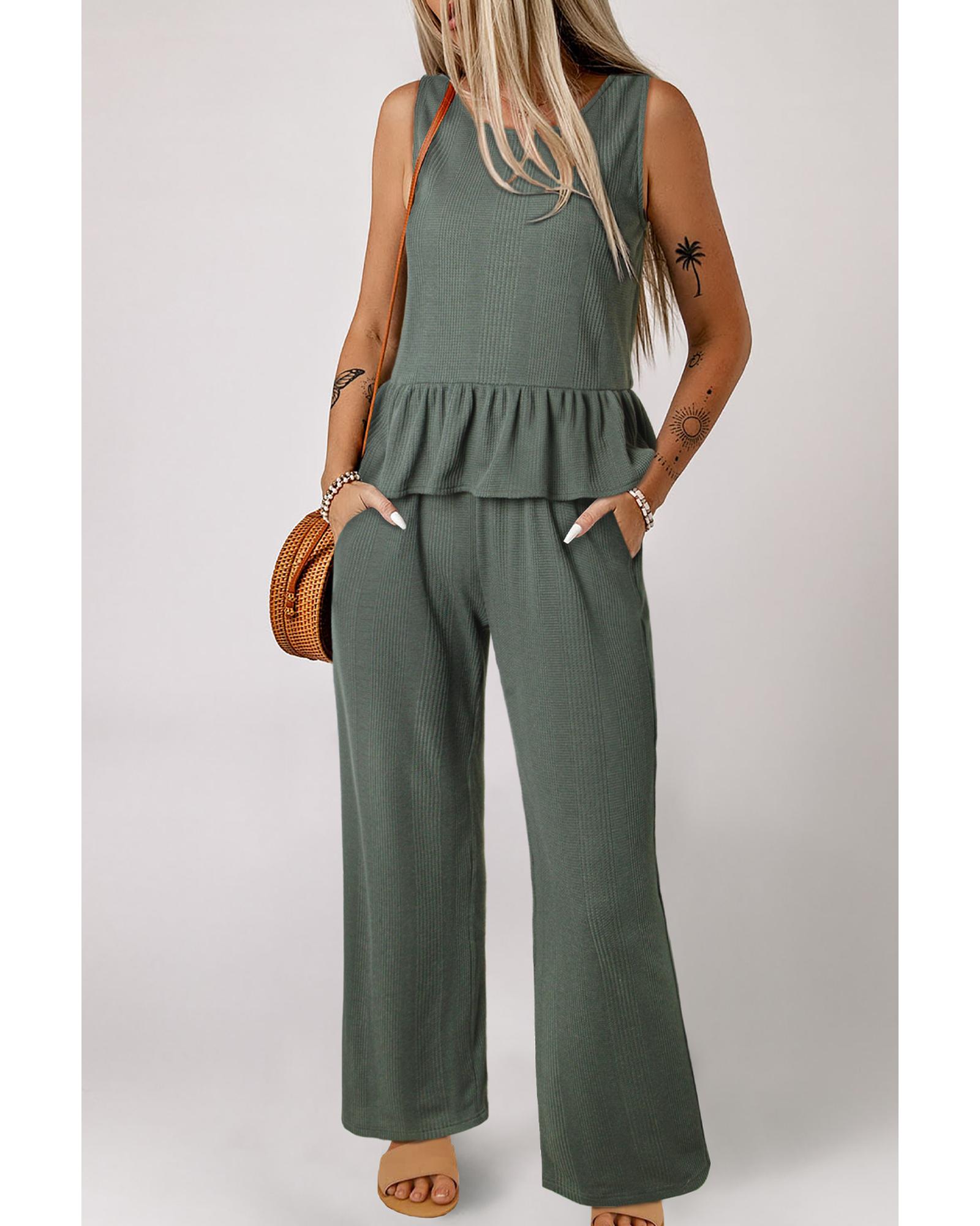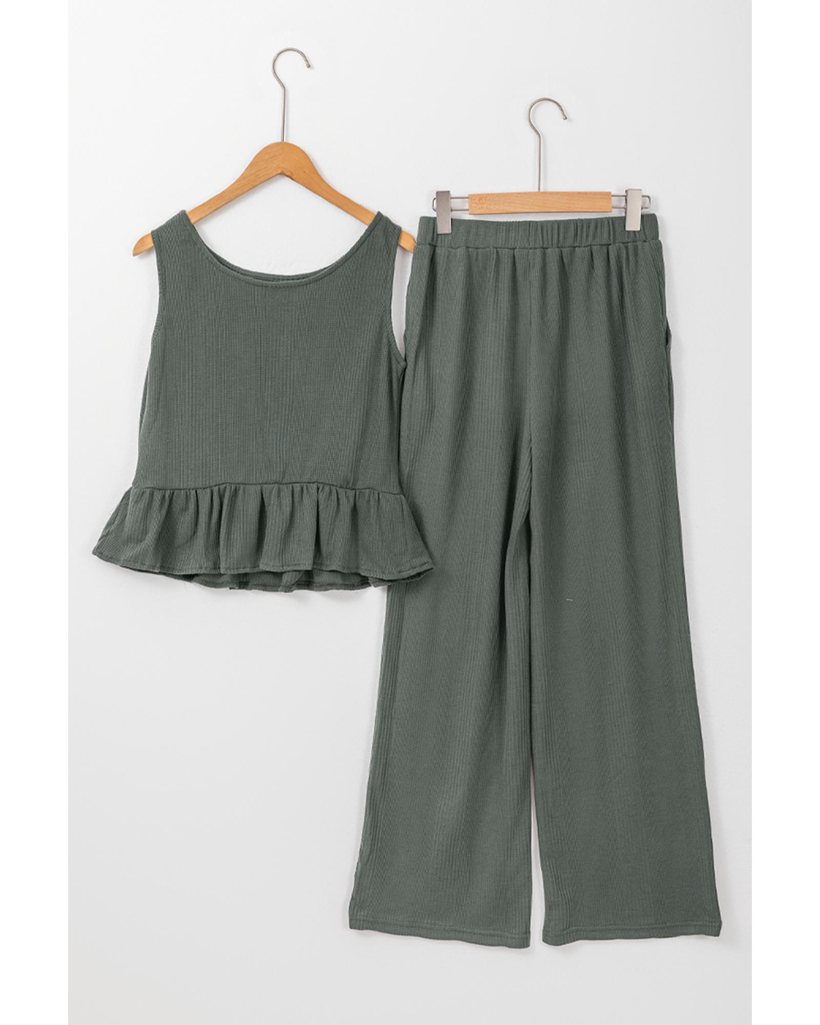 Duffel Green Solid Color Ribbed Ruffle Tank Top and Pants Set – XL