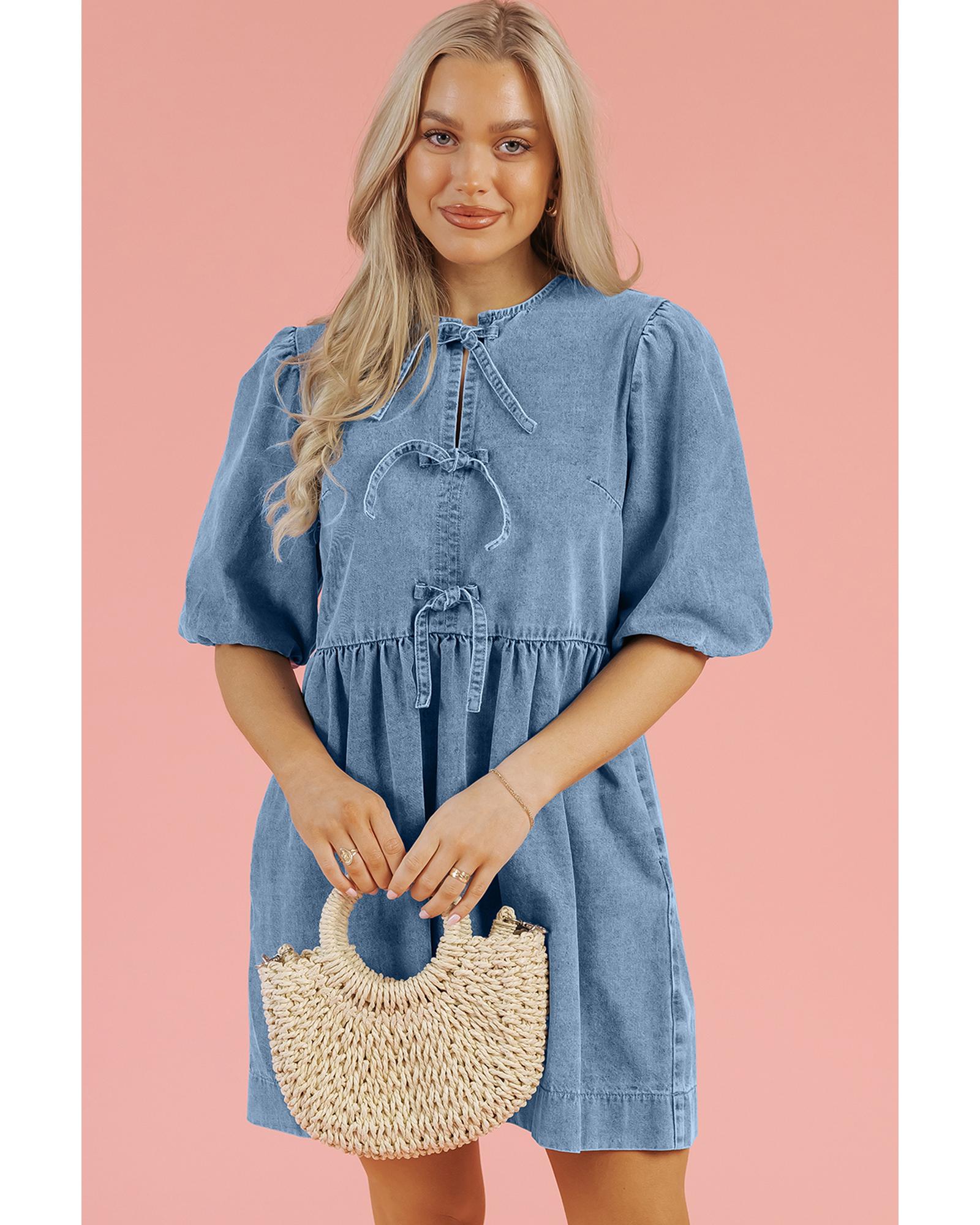 - Dusk Blue Bowknot Bubble Sleeve Short Denim Dress