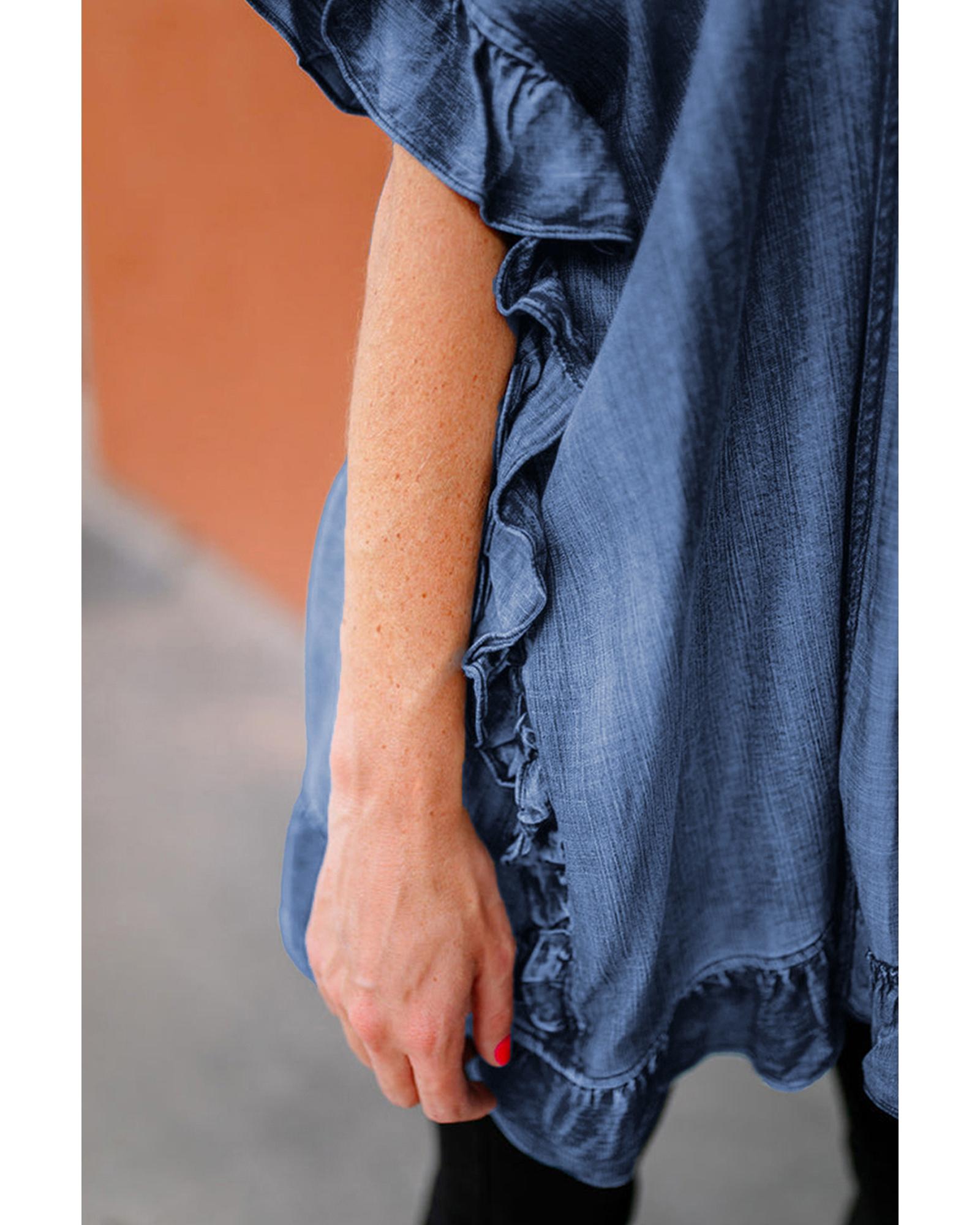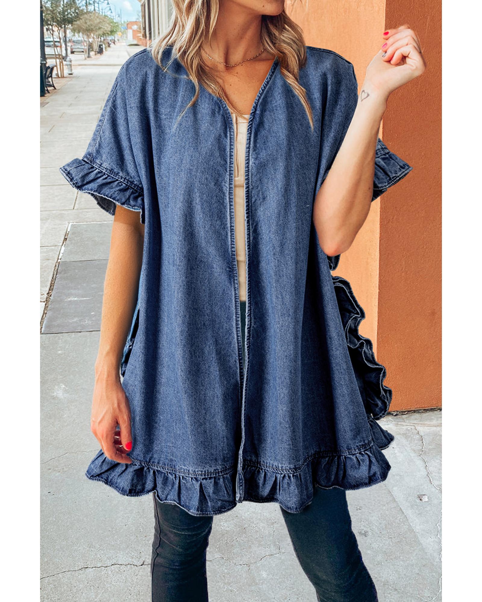 Dusk Blue Chambray Ruffle Hem Half Sleeve Open Loose Kimono – S