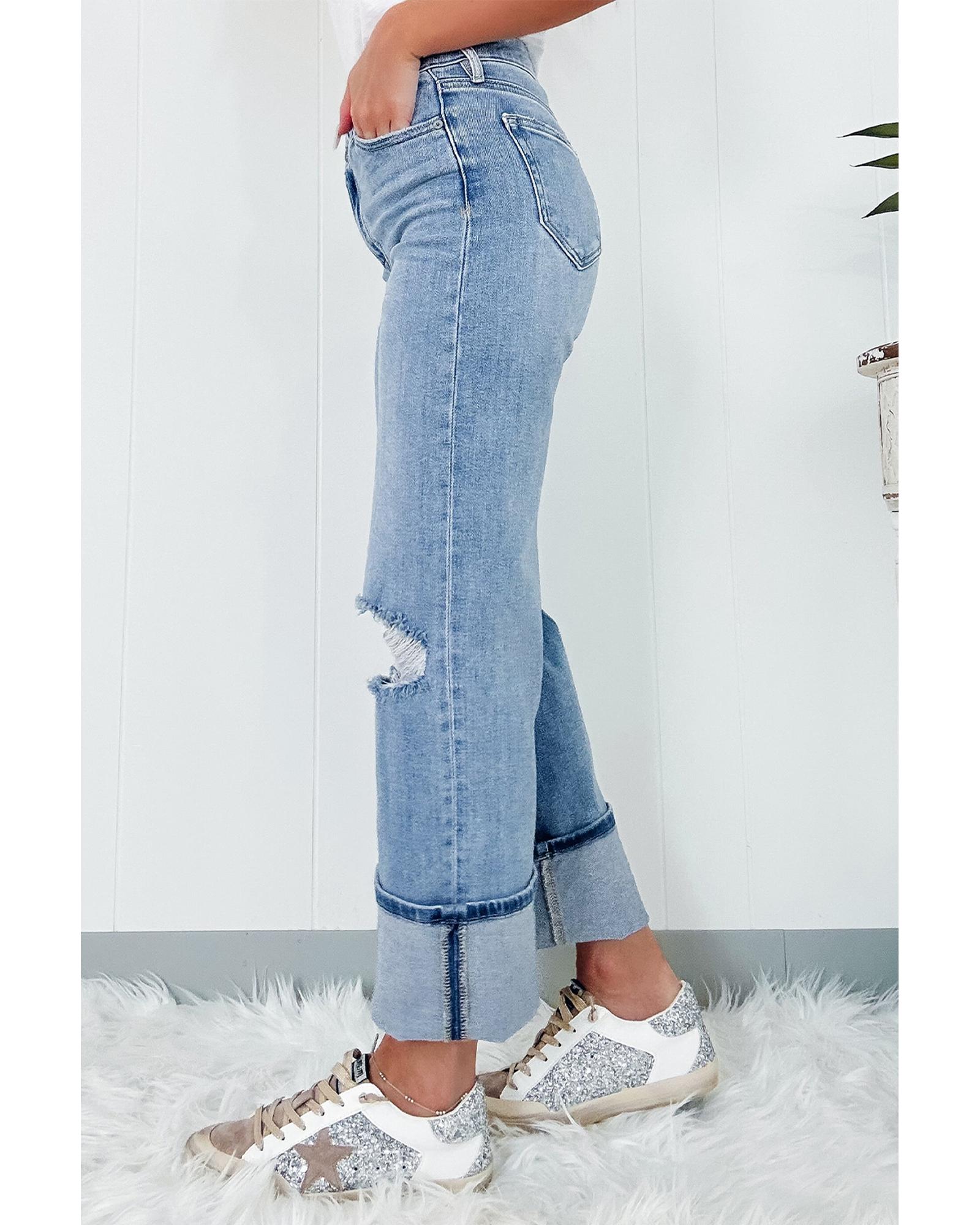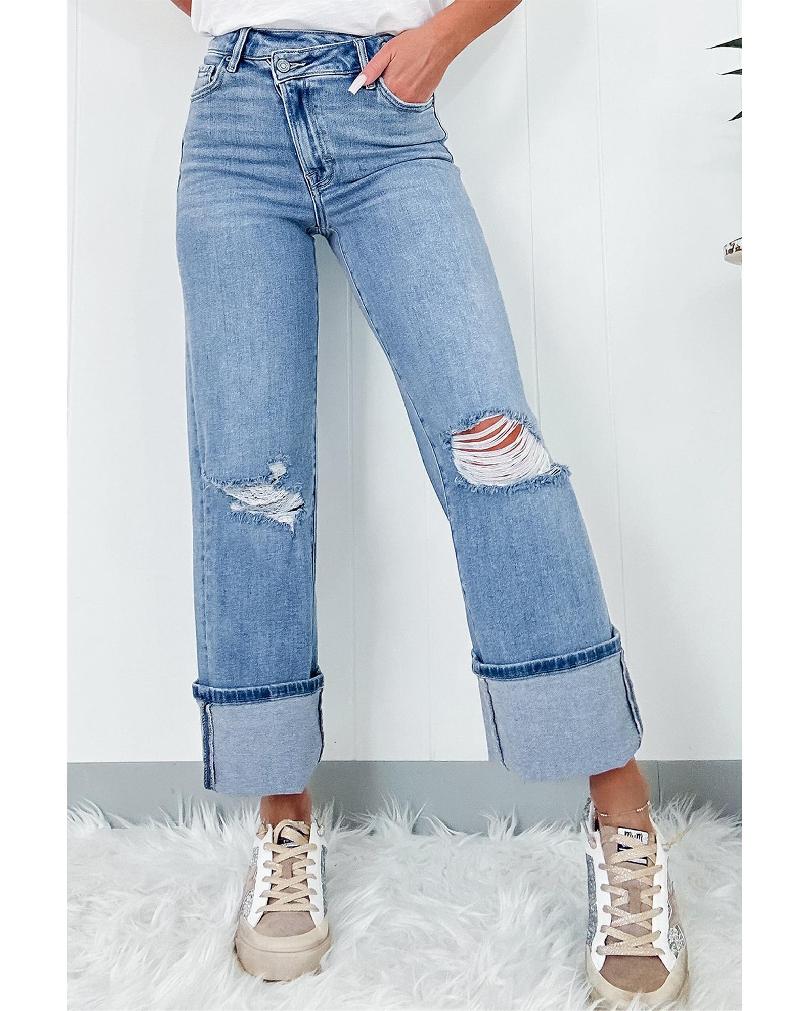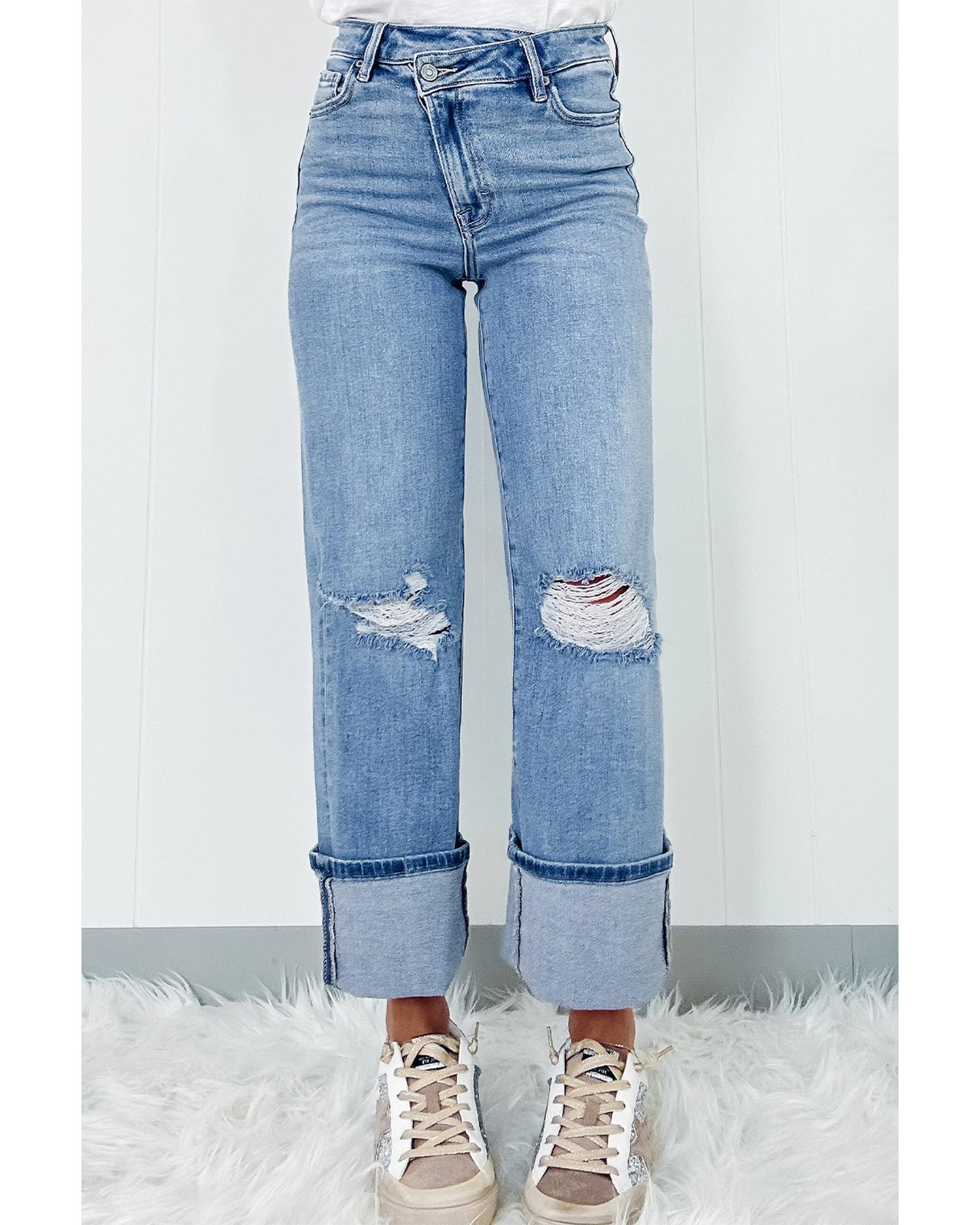 Dusk Blue High Rise Asymmetric Button Zip Fly Ripped Jeans – 12 US
