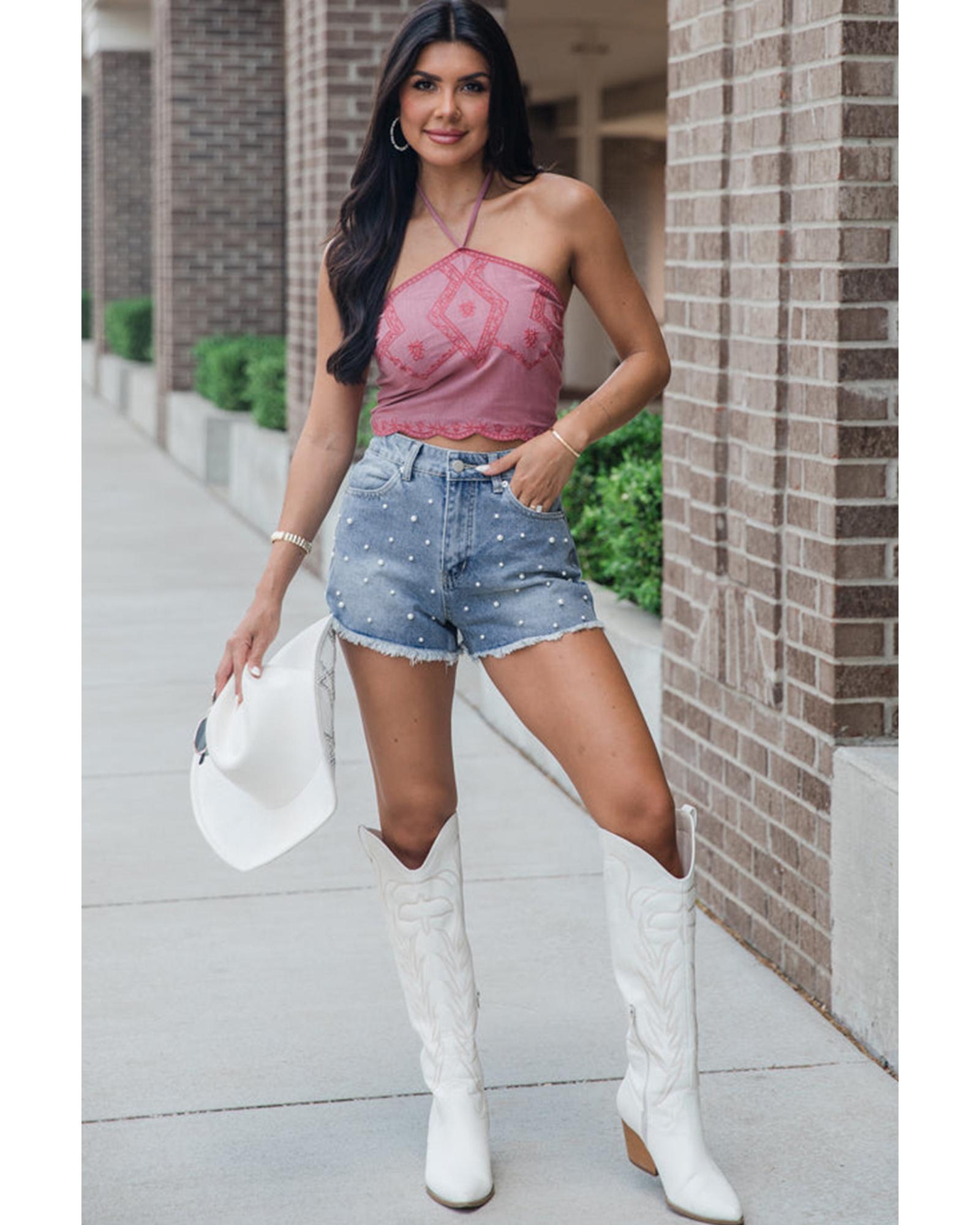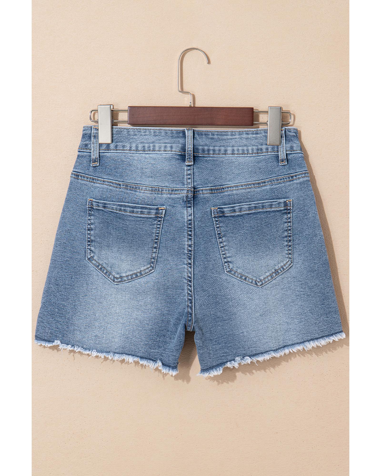 - Dusk Blue Pearl Beaded Raw Hem Medium Wash Denim Shorts
