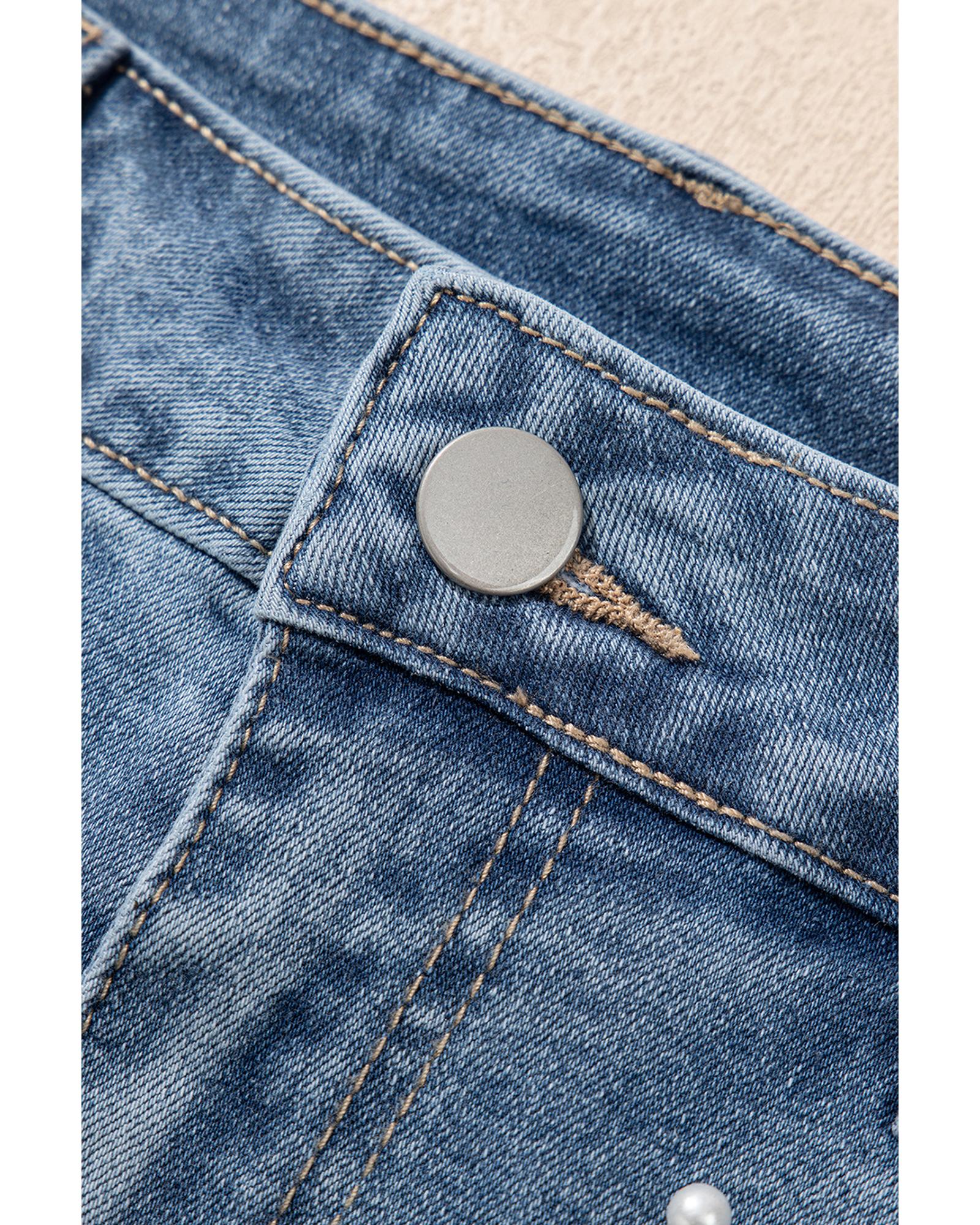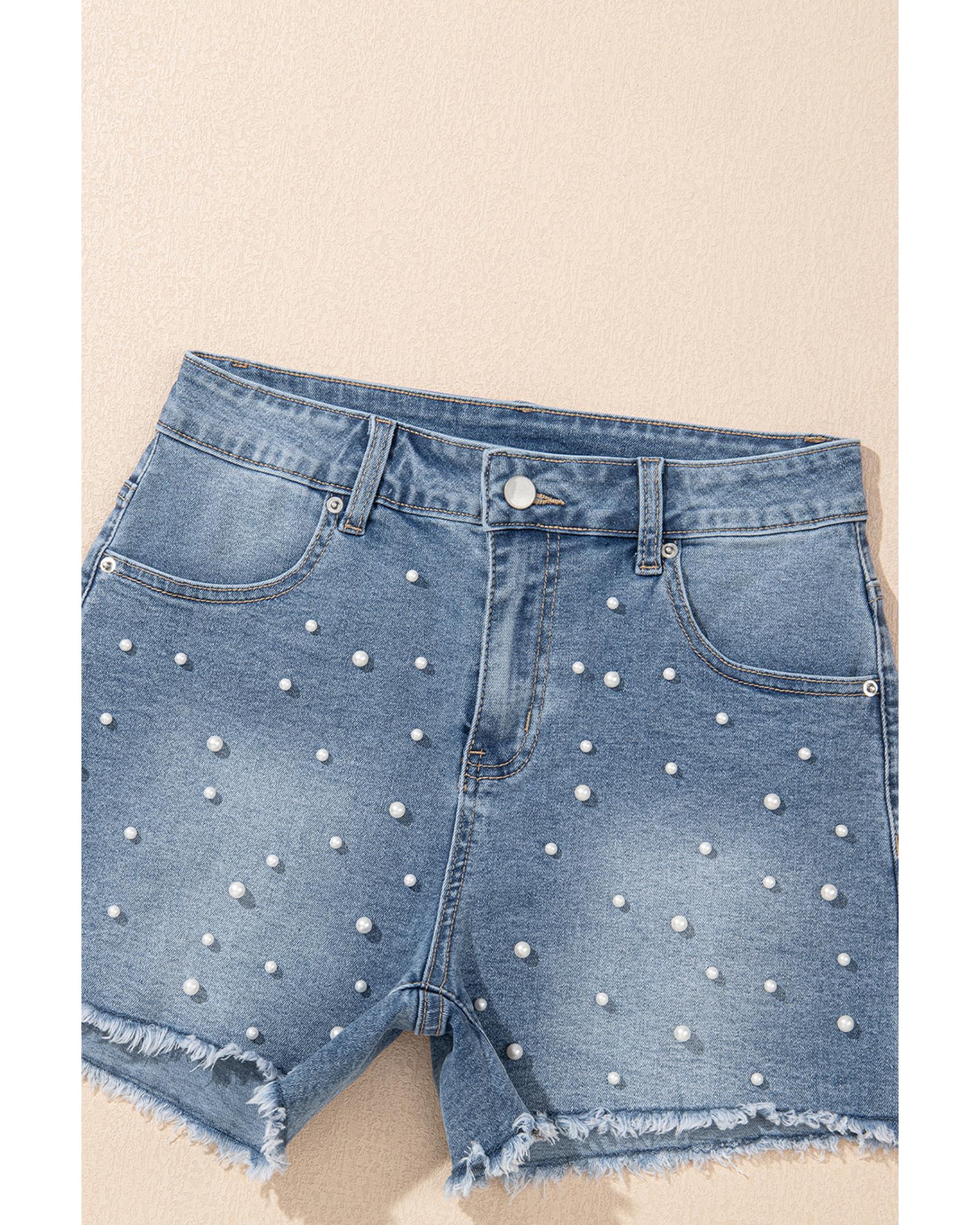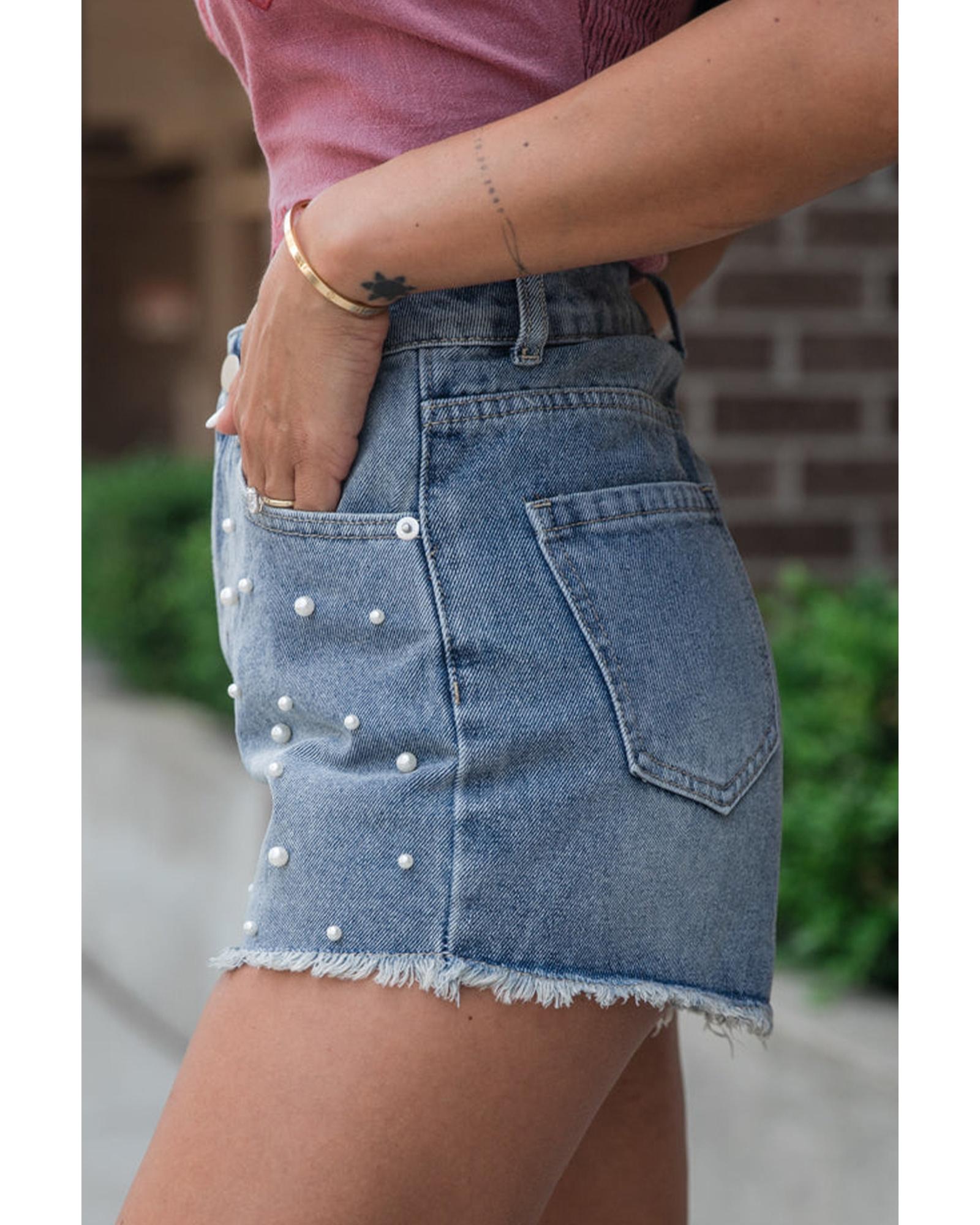 - Dusk Blue Pearl Beaded Raw Hem Medium Wash Denim Shorts