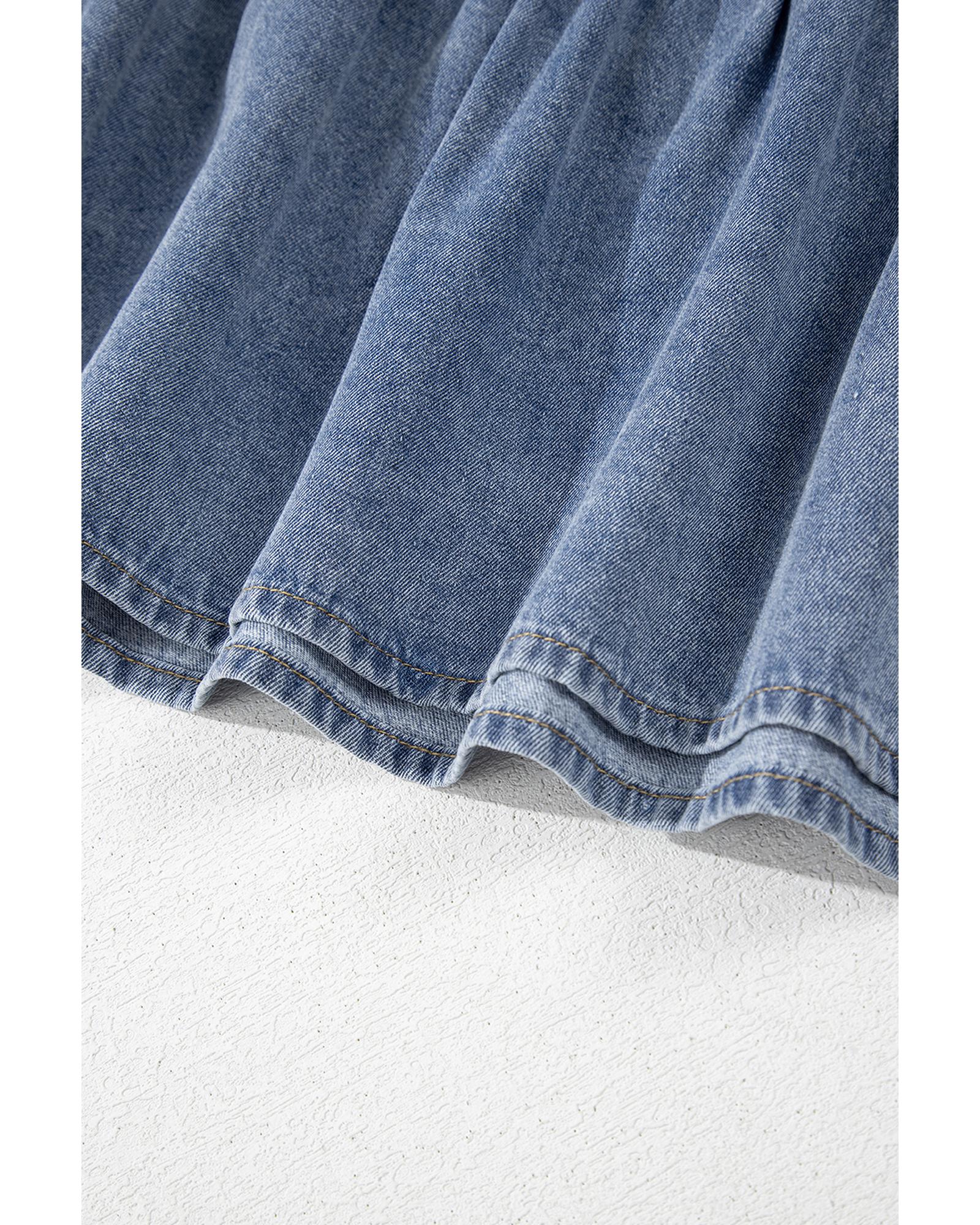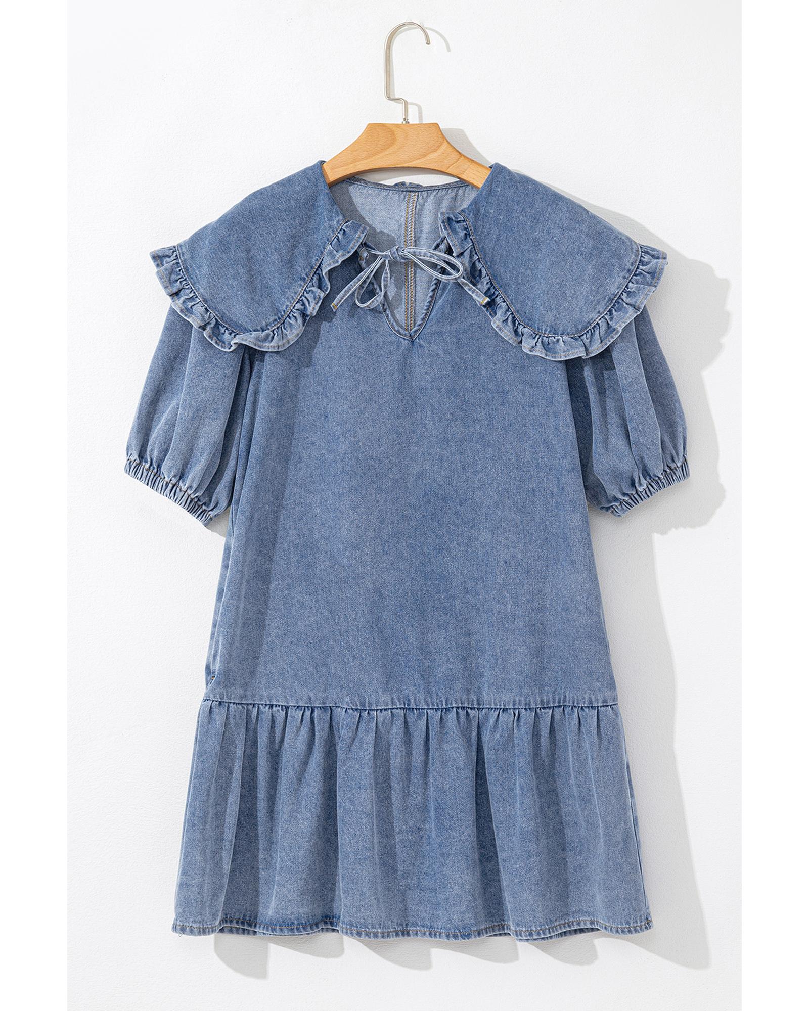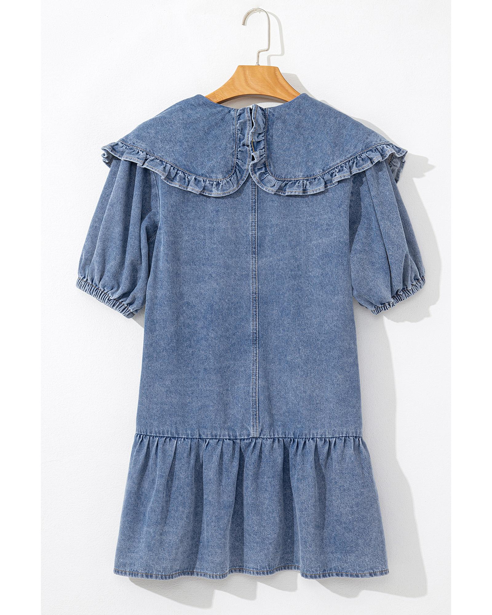 Dusk Blue Ruffled Collared Side Pockets Puff Sleeve Denim Mini Dress - M Original price was: $81.99.Current price is: $44.99.