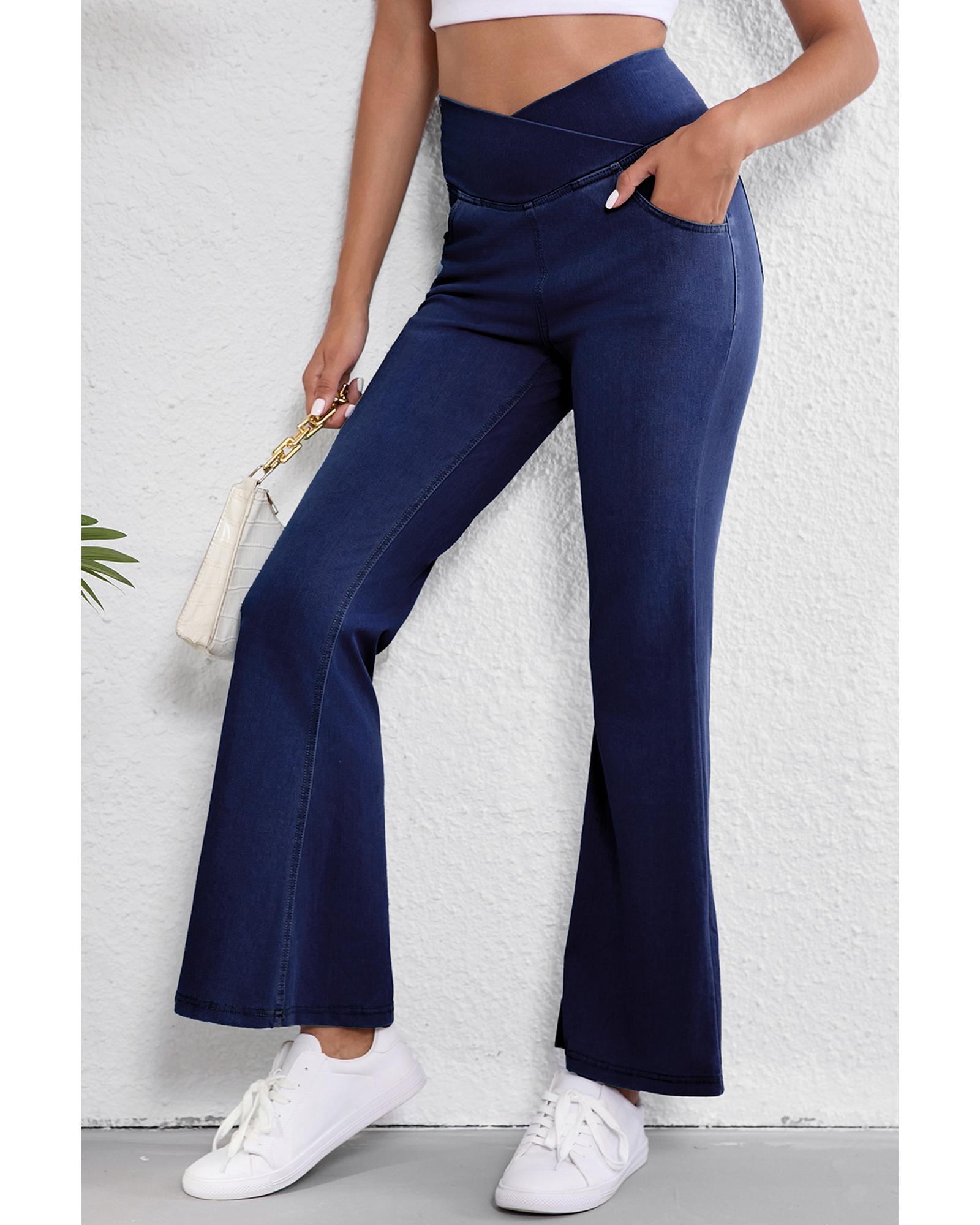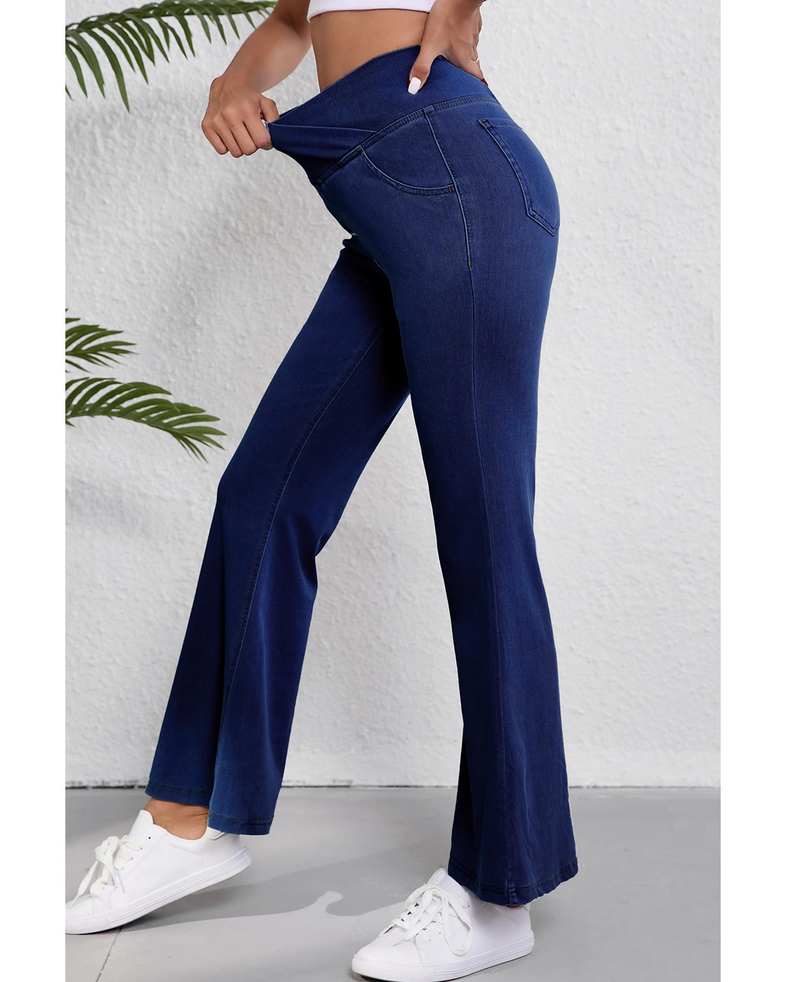 Dusk Blue Solid Crossed Waist High Elastic Fit Flare Knit Jeans – S