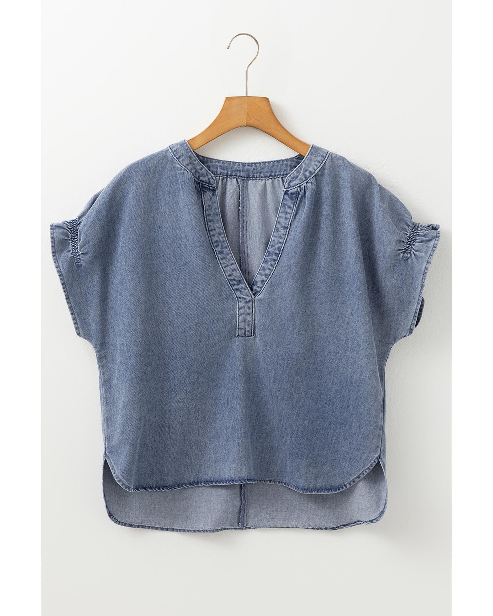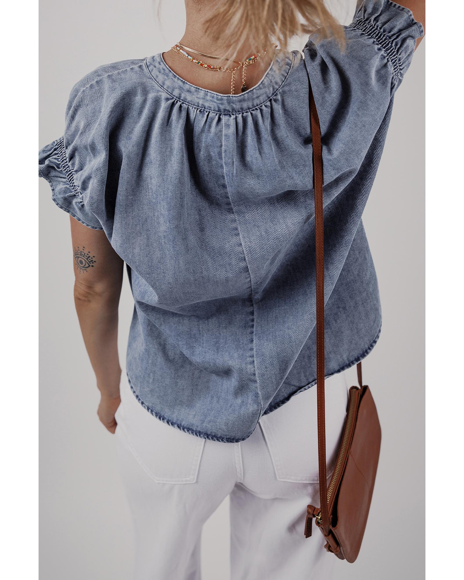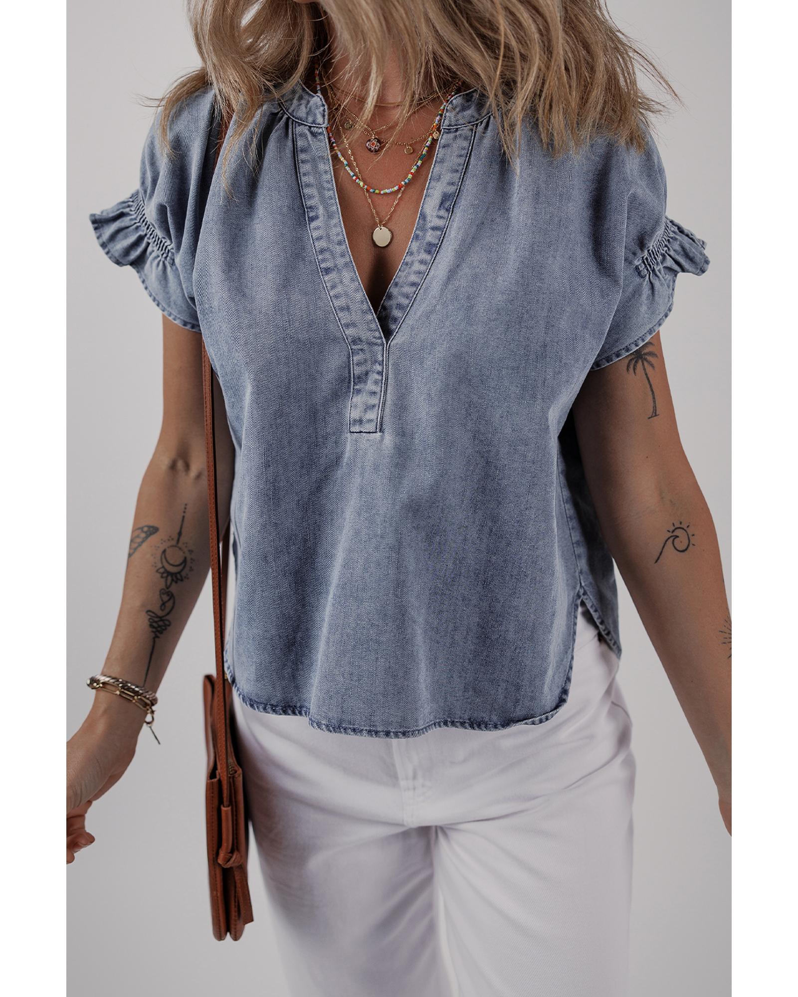 Dusk Blue V Neck Ruffled Short Puff Sleeve Denim Top – L
