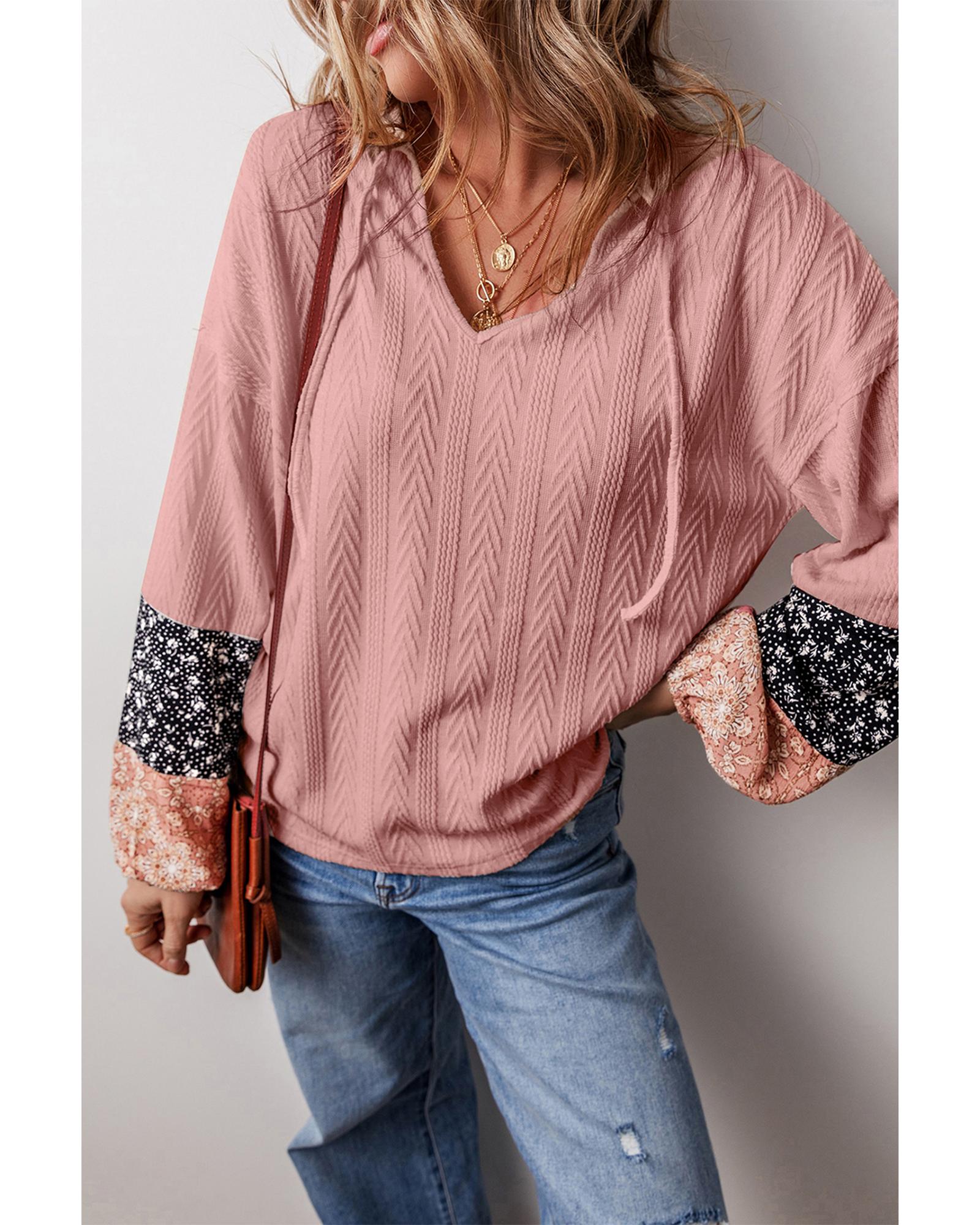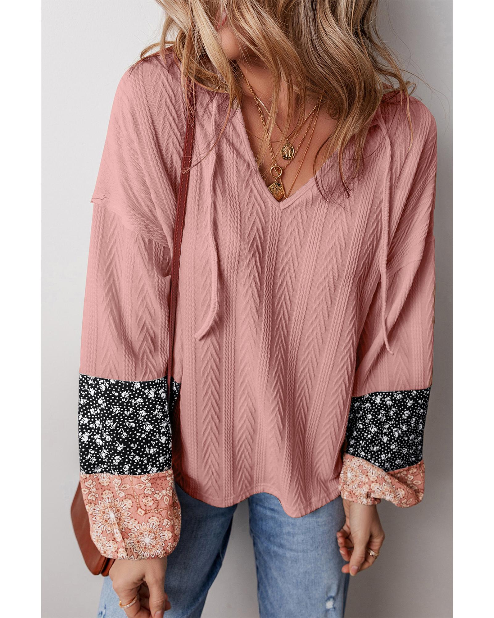 Dusty Pink Floral Patchwork Textured Knit Drawstring V Neck Blouse – L