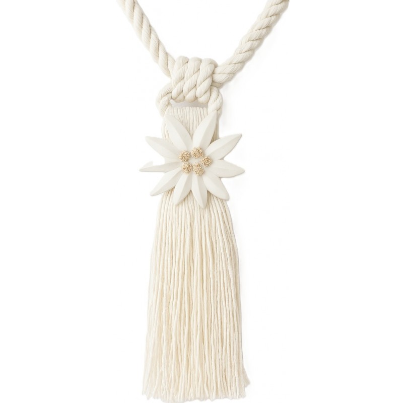 This tieback is a beautifully crafted piece that blends softness with sculptural elegance. Featuring a twisted white rope and delicate strands of white thread that form a soft flowing tassel. At the heart of the tieback is an edelweiss deigned flower, made form a smooth ceramic. Its pointed petals radiate outward in a starburst-like formation, and the center is adorned with gold-toned finish.