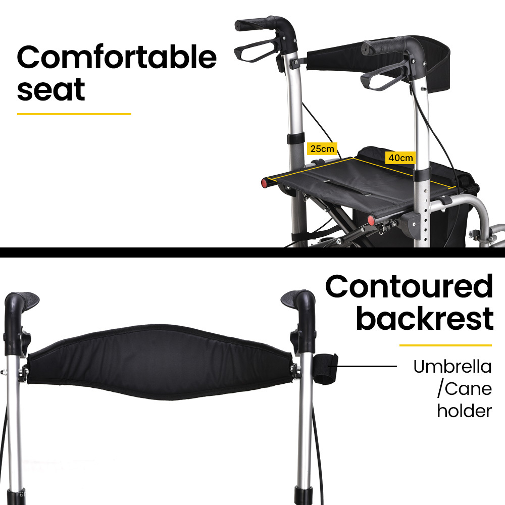 Large 8″ PVC wheels allow the walking frame to roll smoothly over the bumps on a range of surfaces, and the soft rubber tread provides grip both inside and outside. The height adjustable handles offer a highly ergonomic design and feature easy-squeeze dual action brakes. Pushing down on the brake levers activates the park brakes, enabling you to take advantage of the stable seat to rest and watch the world go by.