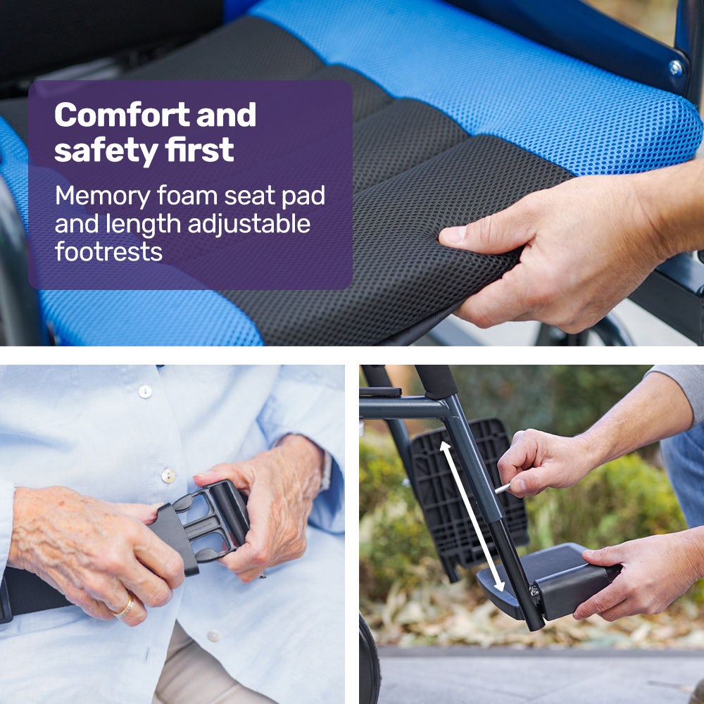 - Easy access and exit with flip-up armrests and fold-up foot rest
