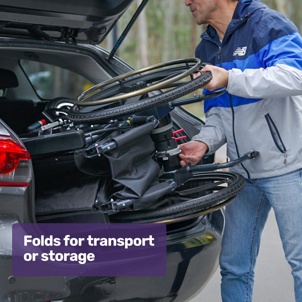 The Equipmed motorised wheelchair is quick to fold. Plus, a sturdy steel frame and easy-to-remove lithium battery mean that it is as light as possible for loading into a car boot or moving into a space-saving storage position.