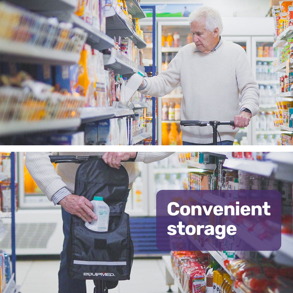The carry bag hooks onto the front of the scooter and hides your personal belongings from sight. It features an easy access pouch for a drink bottle, and can be easily removed for carrying around.
