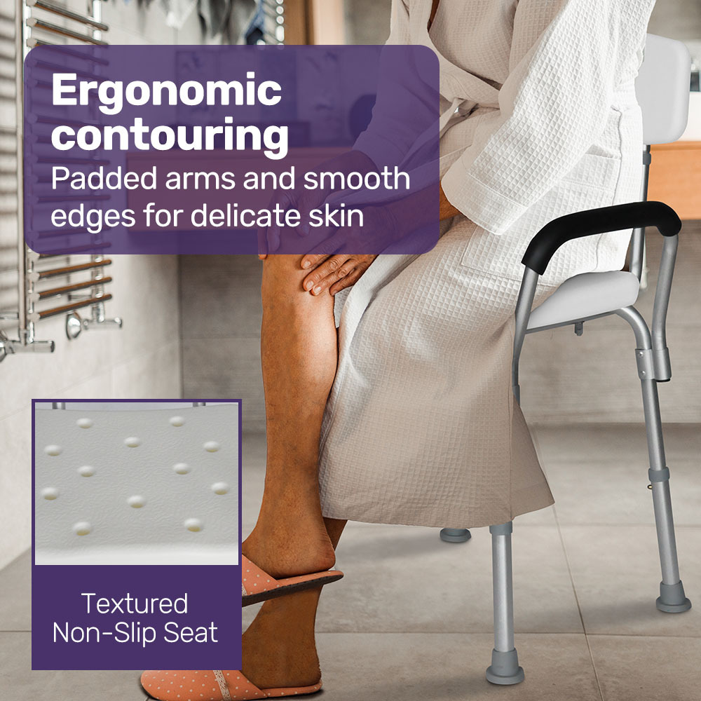 It boasts AquaShield pads on the arms. They are comfortable and resist water absorption preventing germ and bacteria growth. The comfortable seat is also non-slip and helps prevent accidents. The lightweight design makes it easy to move where you want it.