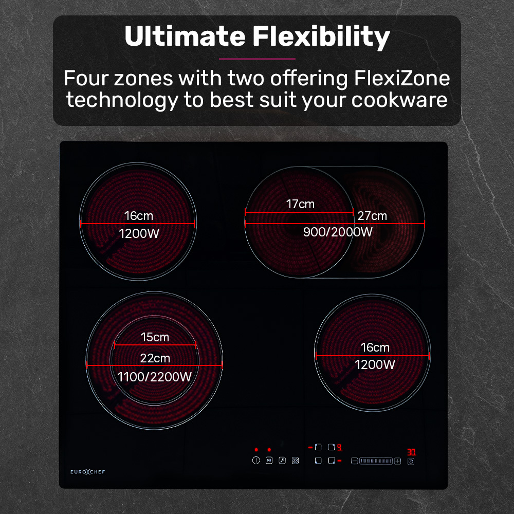 EuroChef 60cm 4 Zone Ceramic Cooktop, 6600W Electric, FlexiZone Adjustable Size Hobs, Touch Controls