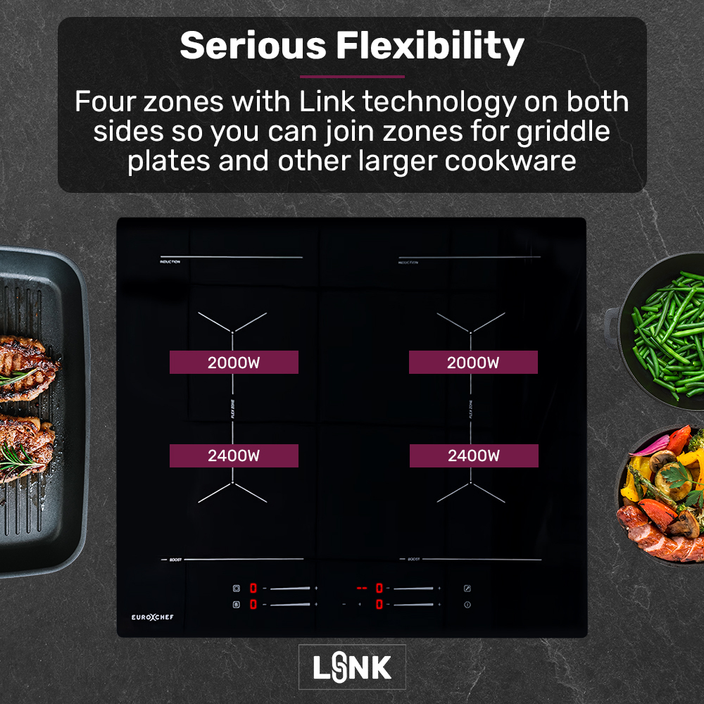 EuroChef 60cm 4 Zone Induction Cooktop, 7200W Electric, Dual Link Bridged Zone Hobs, Touch Controls