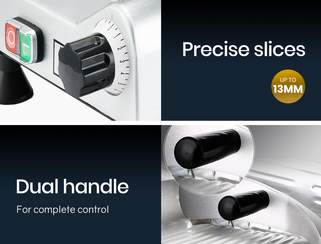 With a safety first design, fingers are shielded with the RingGuardâ„¢ system, and the large baffle serves a protective barrier. The solid base and non-slip feet also combine to deliver safe handling and control. The aluminium base is rust free and the entire unit is easy to keep clean. Precise thickness control lets you adjust from wafer-thin slices to 13mm cuts making it not only suitable for cold meats, but also for cheese, fruit and vegetables.
