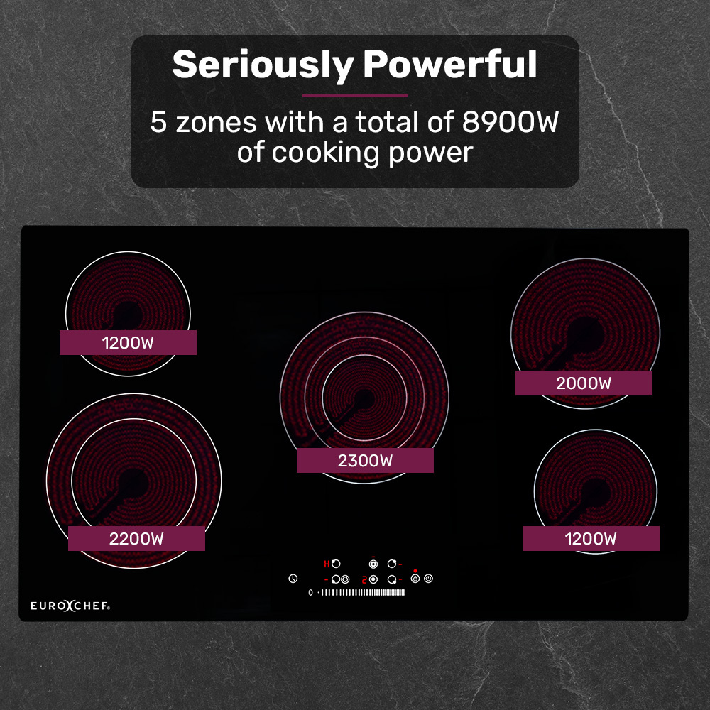 EuroChef 90cm 5 Zone Ceramic Cooktop, 8900W Electric, FlexiZone Adjustable Size Hobs, Touch Controls