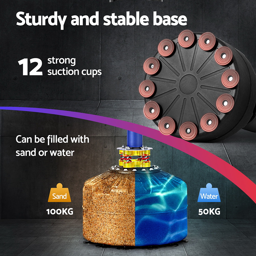 Get your daily boxing routine done in style and convenience with the Everfit Boxing Bag Stand. Made from sturdy multi-layered material, the boxing bag and stand are designed to absorb whatever you throw at it, giving you a real workout. The thick and sturdy base keeps the bag in one place and prevents tipping. It can be secured with 12 strong suction cups, and you can fill the base with water or sand to guarantee stability. The reinforced shock absorption system with four springs cushioning ensures reduced vibration and quiet operation, so you can exercise in comfort and quiet. The high rebound bag easily returns to its original position after punching and gives you a range of movement to practice with. Easy to install and easy to maintain, the Everfit Boxing Bag Stand will help relieve stress, improve your physical defence and keep you fit.