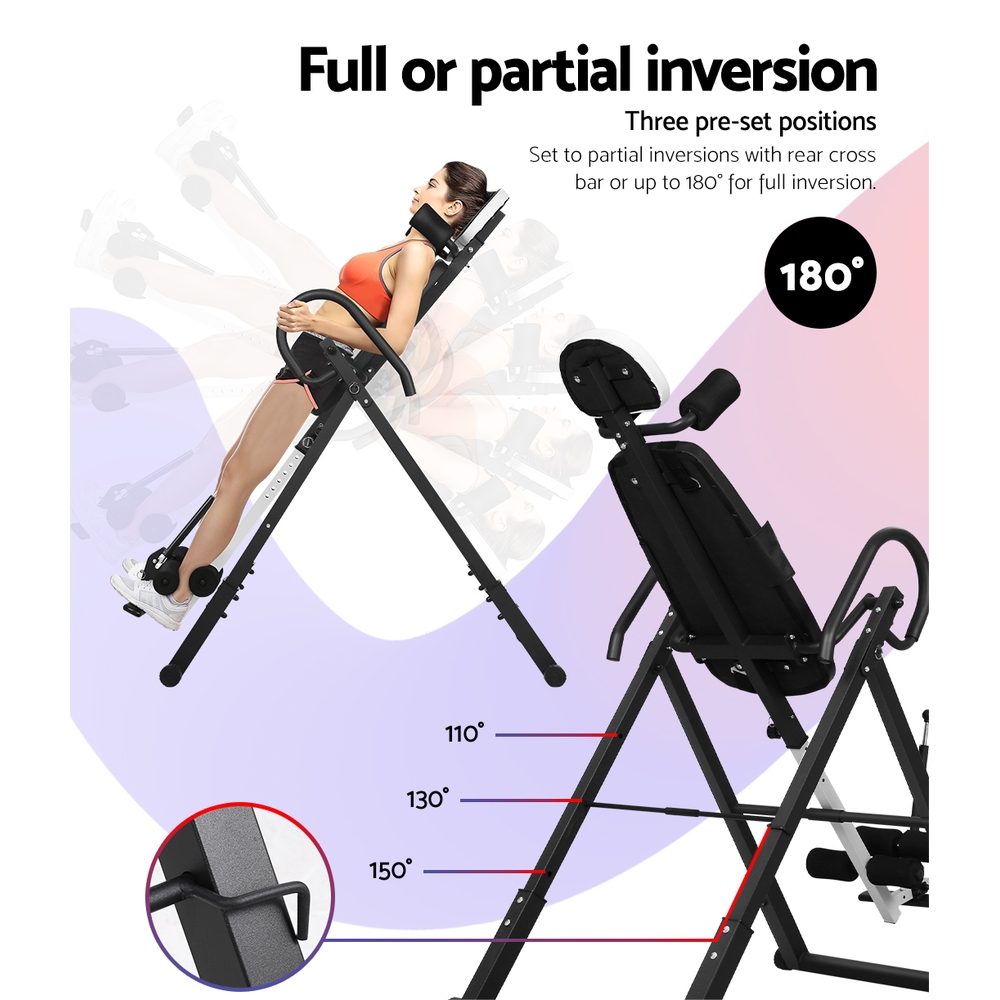 If you often suffer from back pain after a day of work, our Everfit Inversion Table may be the solution for you. Hanging upside down can help to improve flexibility, reduce nerve pressure, realign the spine, and relax tense muscles. The extra wide backrest is padded with thick high-density foam to provide you with adequate support and comfort. The inversion level is adjustable up to 180 with three pre-set locking positions. The safety belt and locking ankle clamp always keep you securely in place, the removable cushioned lumbar support provides added comfort, and the padded U-frame handles ensure that you always have a firm grip and can easily return to the upright position. The sturdy frame is constructed with industrial-strength powder-coated rust-proof steel and can support a maximum weight of up to 120kg. The height can be adjusted to accommodate all users. Best of all, the inversion table is foldable so you can easily store it away. Get a new perspective and feel the difference with an Everfit Inversion Table.