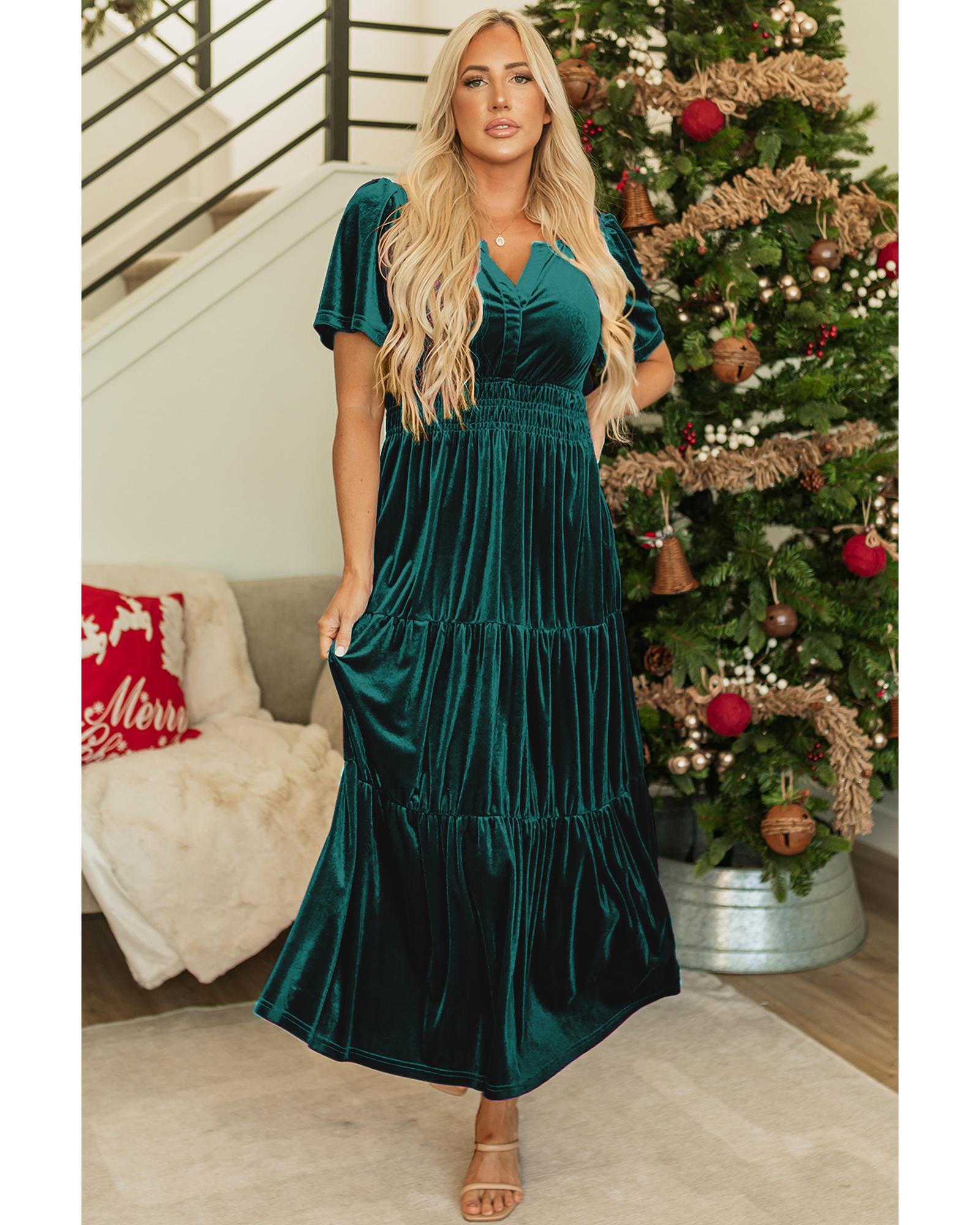 - Evergreen velvet short sleeve shirred waist tiered maxi dress