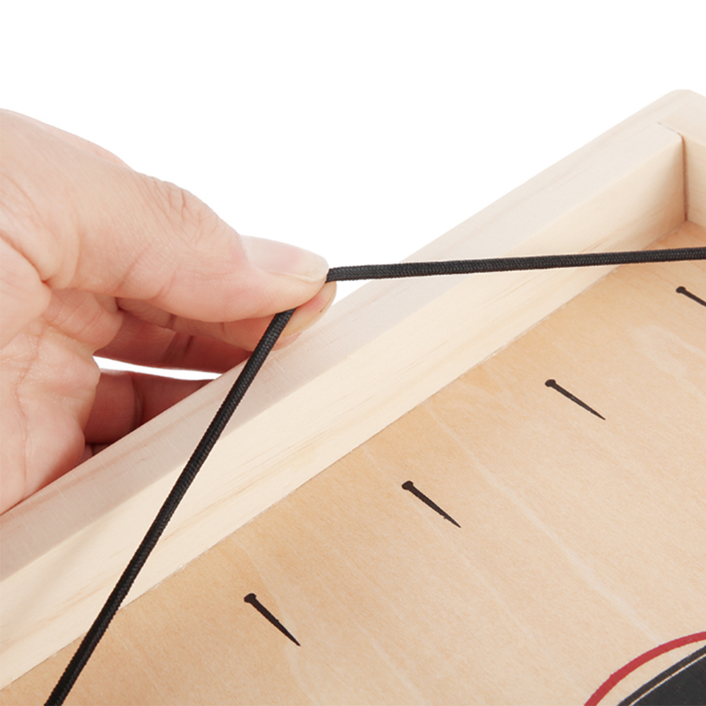 2. Start the game and place five pucks on each side of the board. Slide both ends of the elastic band into the side grooves so that they snap into place. The two players applauded the “High Ten” style to start the game.
