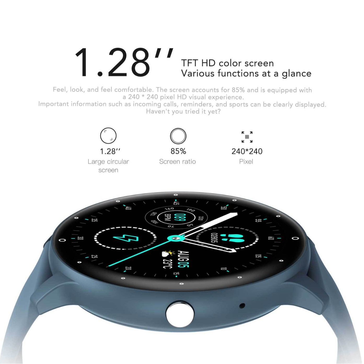 • 1.28-inch TFT HD Color Screen: Large circular screen with 240×240 pixel resolution and narrow border for a clear and immersive visual experience.