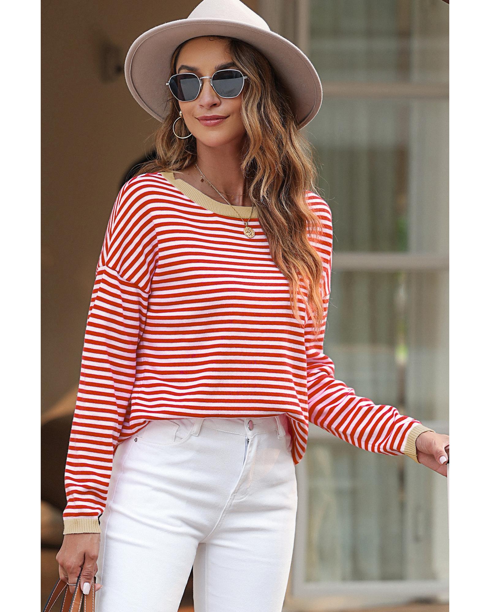 - Fiery Red Contrast Trimmed Striped Drop Shoulder Sweater