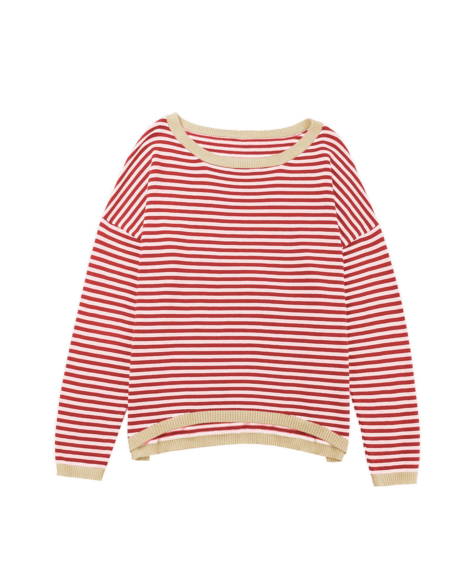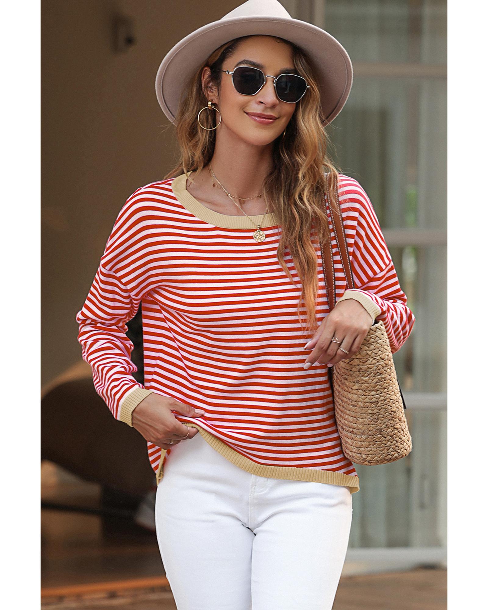 • Fiery Red Contrast Trimmed Striped Drop Shoulder Sweater