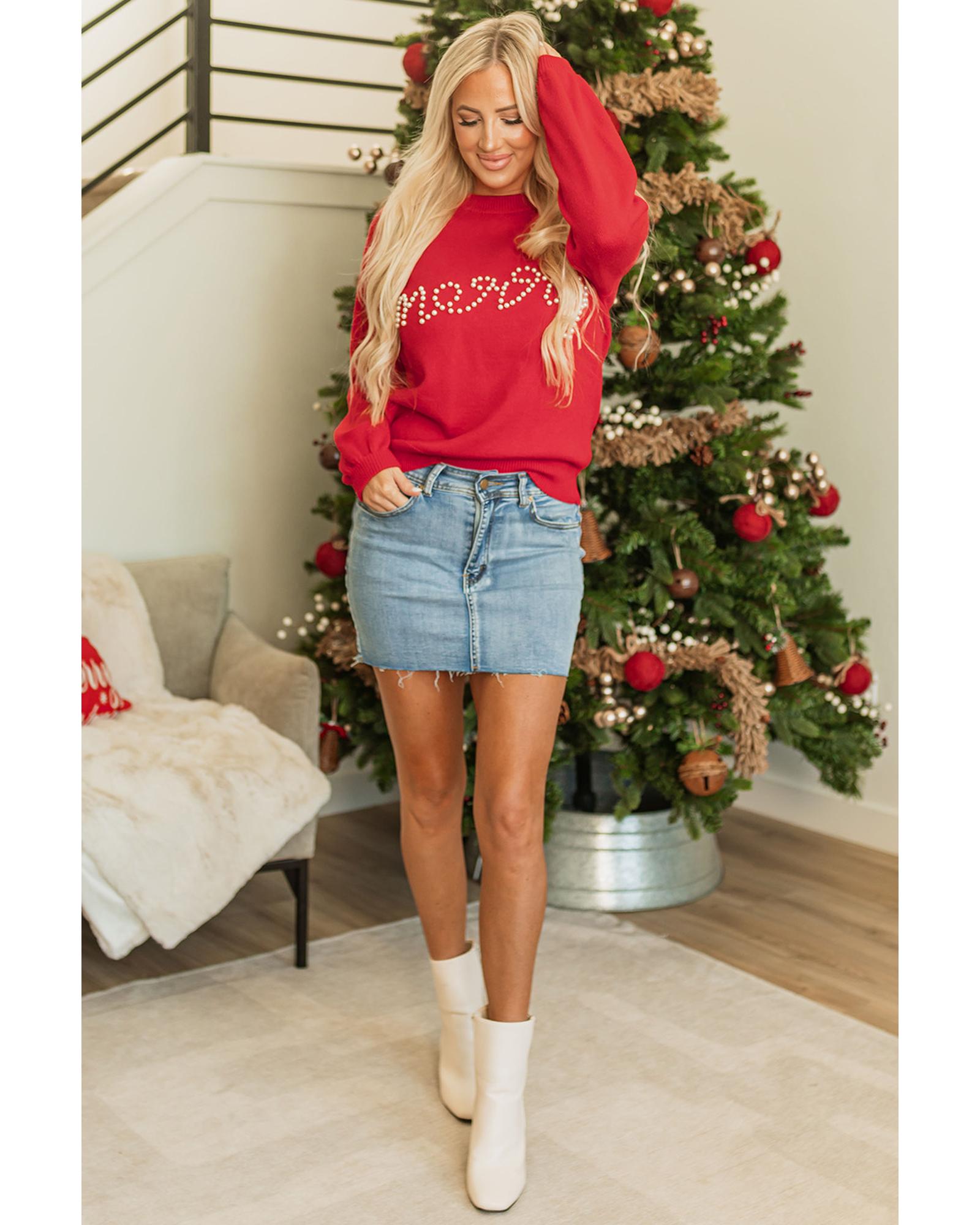 Fiery Red Pearl Beaded Merry Casual Sweater – L