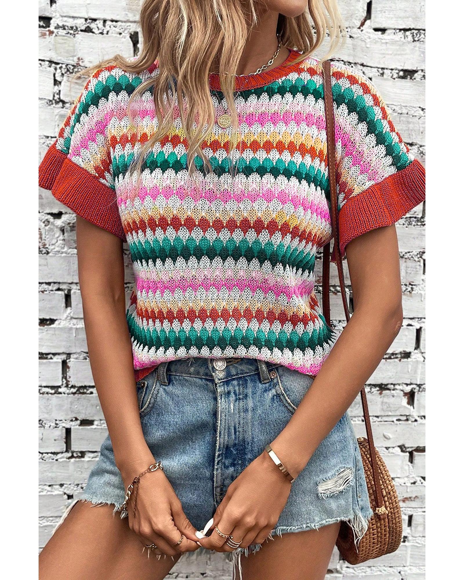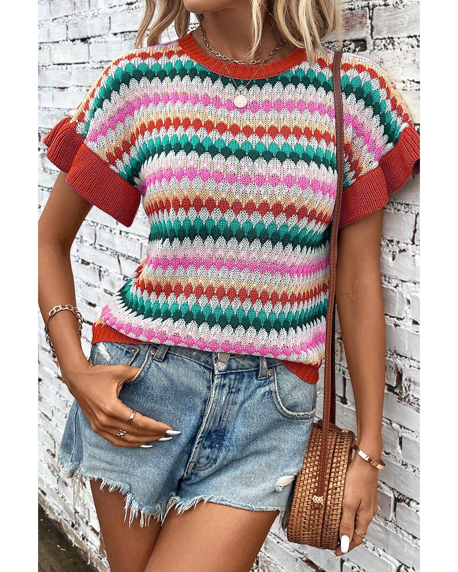 Fiery Red Trimmed Ruffle Sleeve Colorful Textured Sweater – S