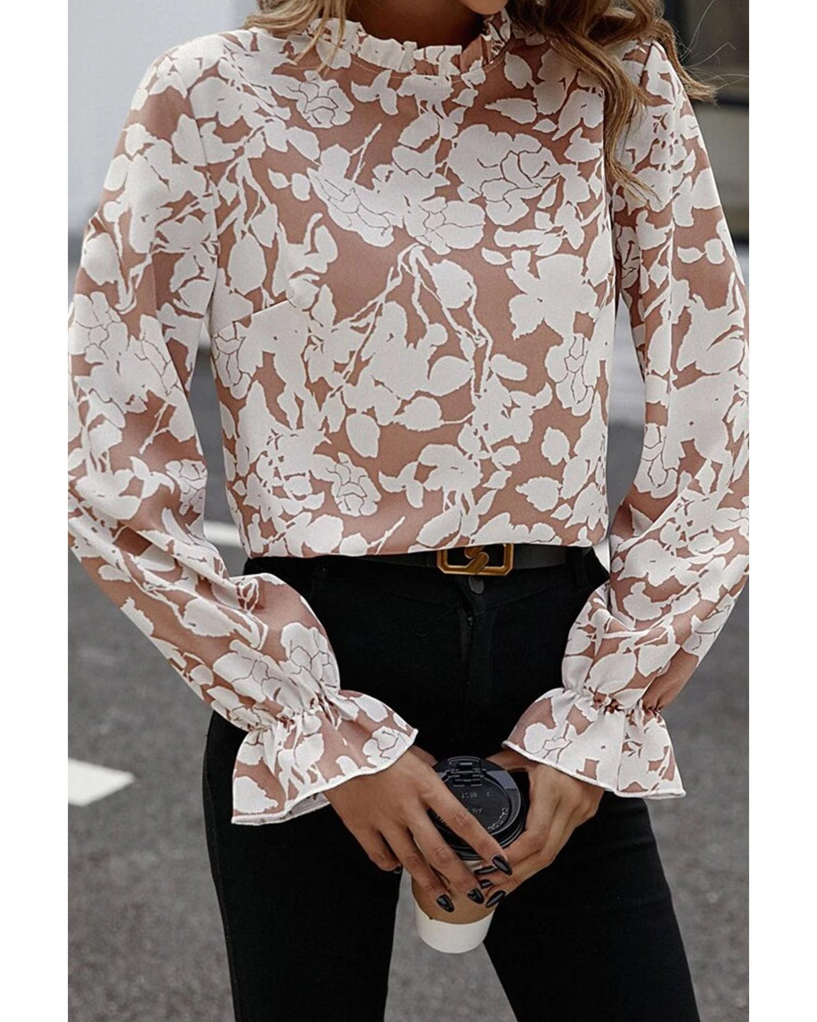 Flaxen Floral Print Frilled Neckline Flounce Sleeve Blouse – S