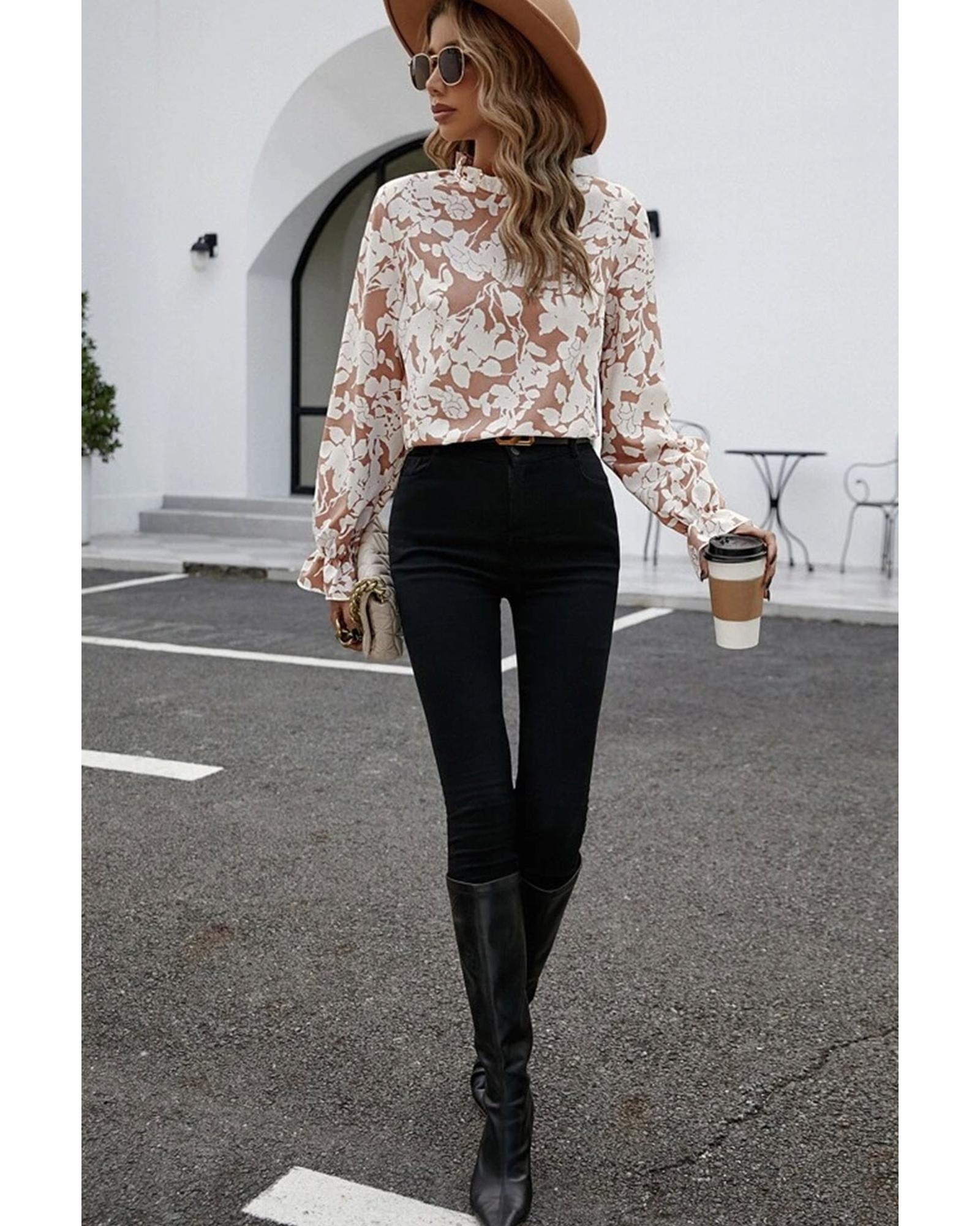 Flaxen Floral Print Frilled Neckline Flounce Sleeve Blouse – XL