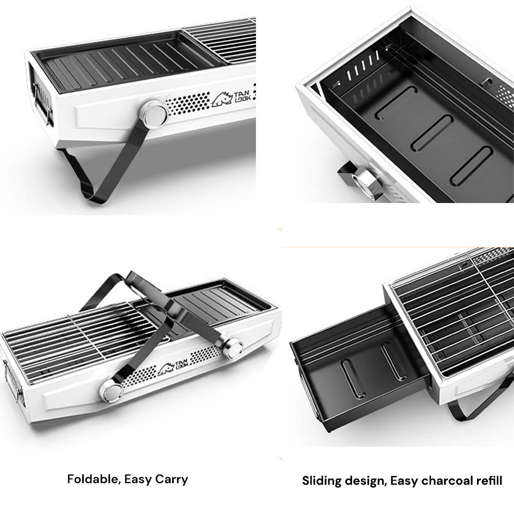 Foldable portable grill, small footprint, only 2.5kg, single handheld.