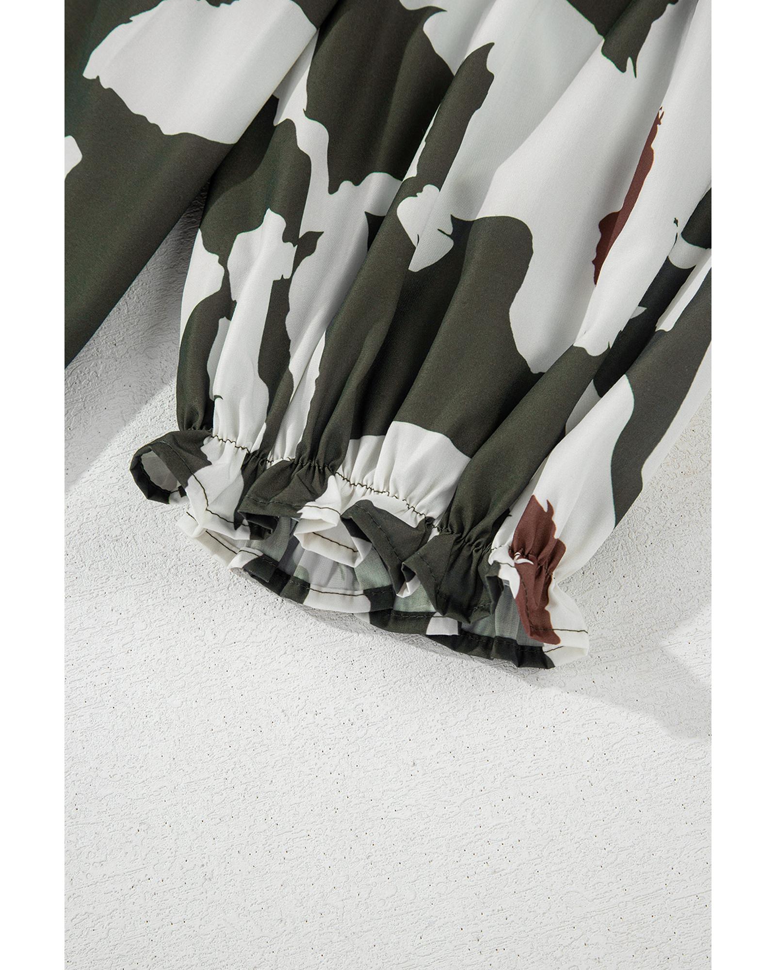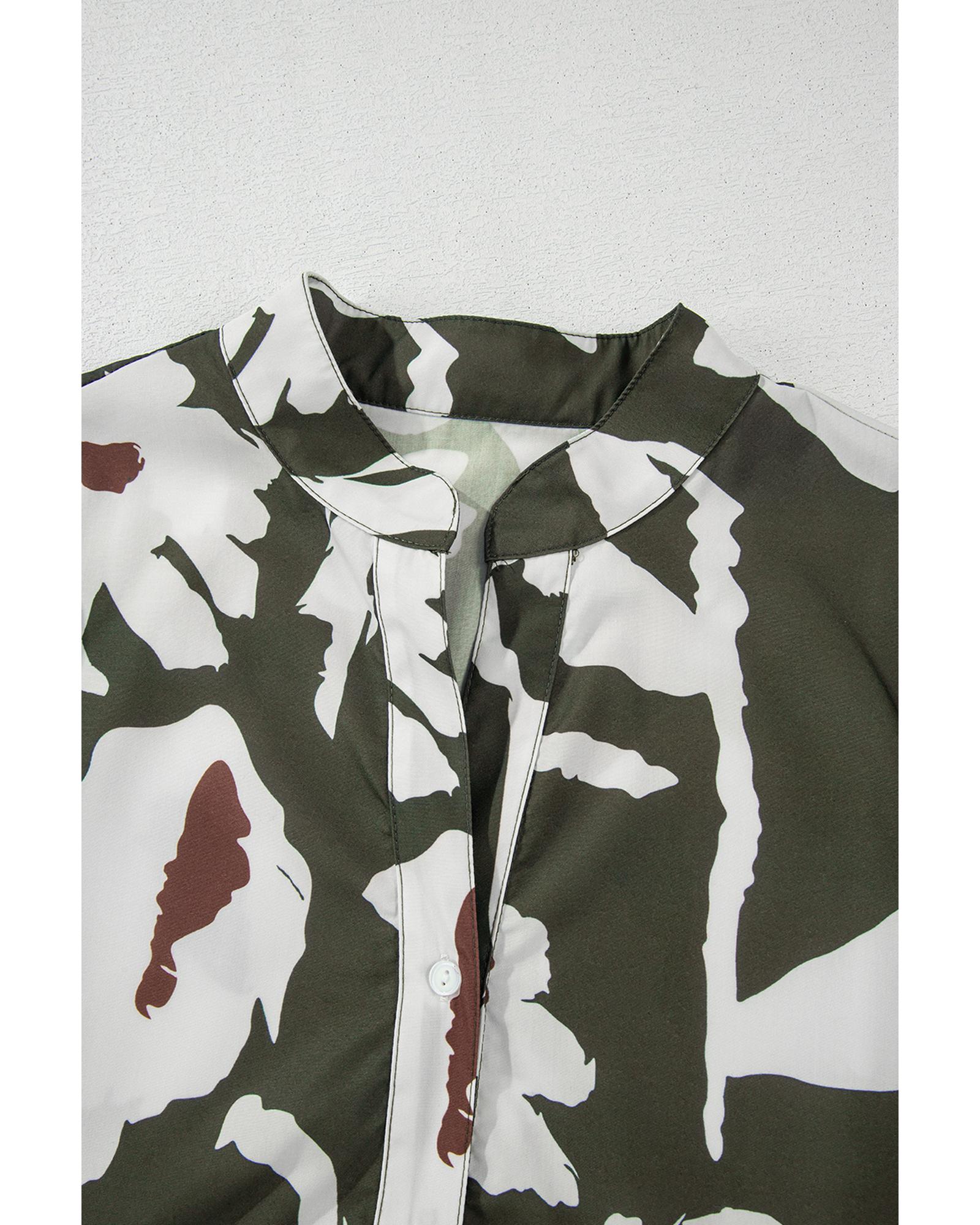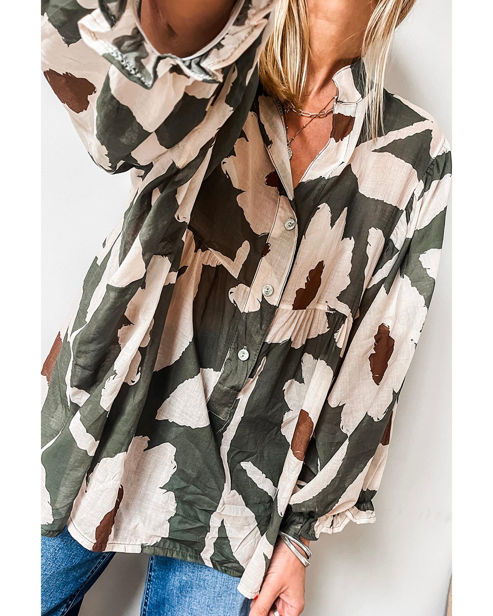 Four Leaf Clover Abstract Floral Print Puff Sleeve Half Button Blouse – XL