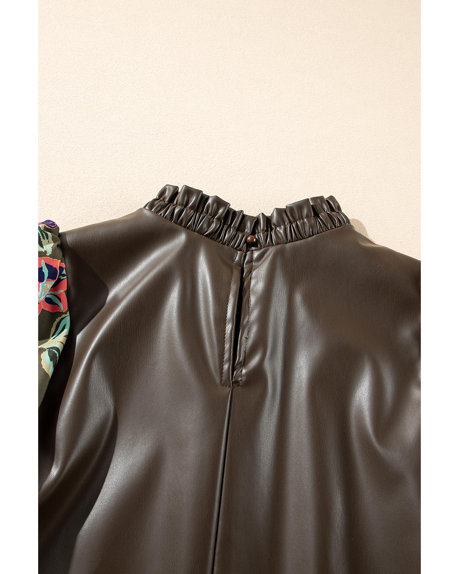Four Leaf Clover Floral Bubble Sleeve Patchwork Leatherette Frilled Round Neck Blouse – S