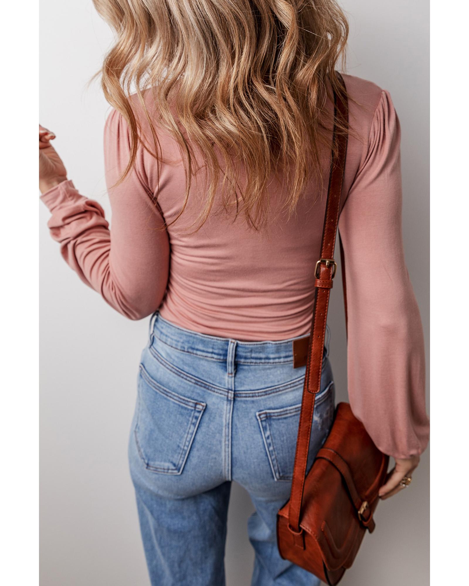 Fushia Plain V neck Long Sleeve Casual Bodysuit – S