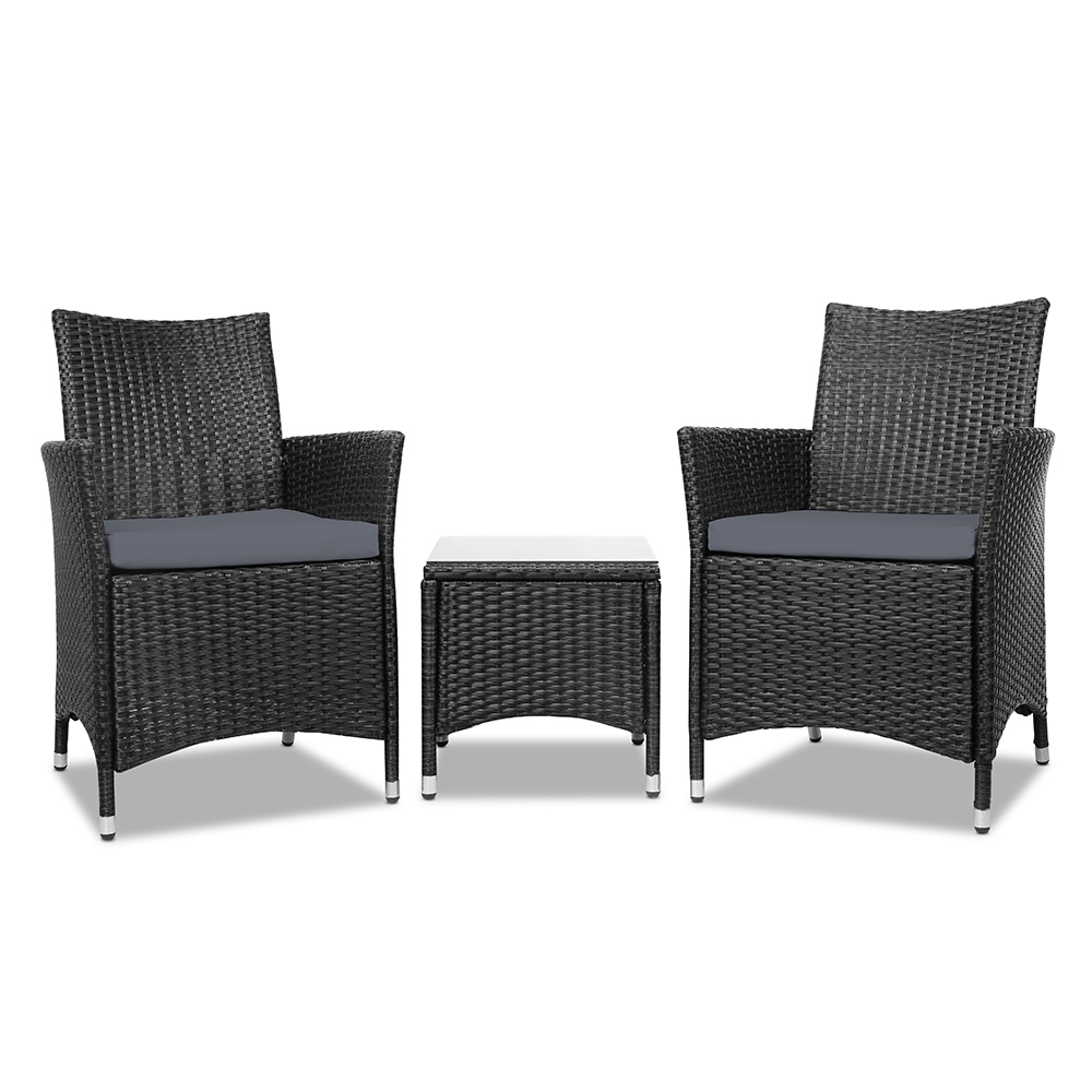 Gardeon 3PC Outdoor Bistro Set Patio Furniture Wicker Setting Chairs Table Cushion Black