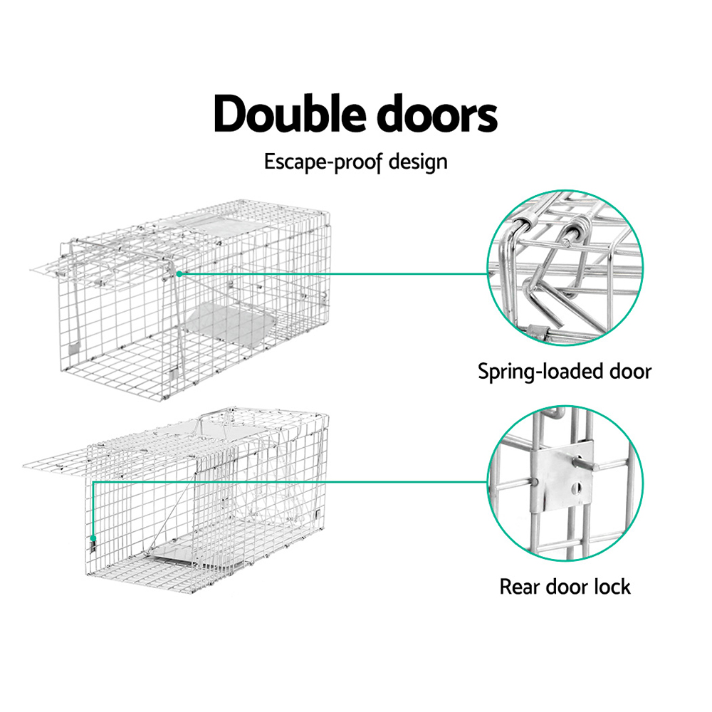 Made from quality rust resistant galvanised iron wire, this humane animal trap cage is built to last for years. Featuring spring loaded door trap with protected handle, automatic locking system that is swift in operation, this cage is designed to ensure safety of both animals and users. Perfect for removing pest animals in backyard and capturing pest alive. Collapsible design and can fold away quickly for easy storage and transportation.