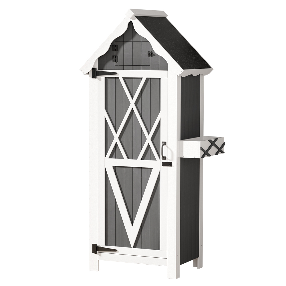 For stylish and practical outdoor furniture that can withstand any weather, look no further than the Gardeon Wooden Storage Shed. The gorgeous cottage shed design is perfect for gardeners in need of generous storage space. The cabinet is made from solid Fir wood and features 3 tiers of shelving, 3 convenient hangers and a cute cuckoo-style upper compartment for all your gardening needs. Its weather-resistant structure and water-resistant asphalt roof will keep it standing through any kind of weather. The magnetic latched door will keep all your goods safe and sound away from the elements and backyard fauna. Use indoors or outdoors for unique rustic appeal. Easy to assemble and even easier to use, youll love the convenience and style of the Gardeon Wooden Storage Shed.