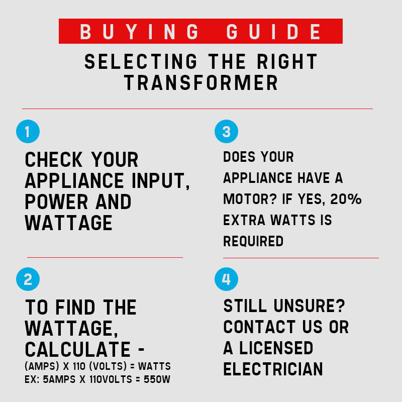 The GENPOWER GSD1000 converts alternating current (AC) 240 volts into 110 volts to allow your US appliance to run in Australia. Just plug the transformer into an Aussie power socket the appliance into the power outlet of the transformer!