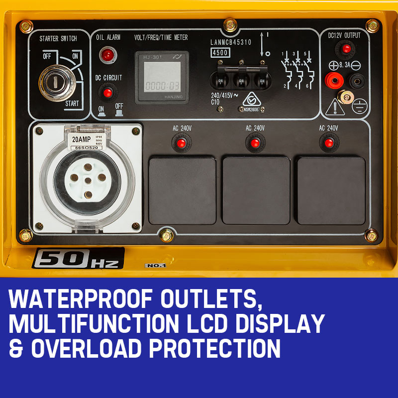 GENPOWER 7kW Peak 5kW Rated Commercial Diesel Generator, Electric Key Start, 1 x 20A 415V 3 Phase, 3 x 15A 240V