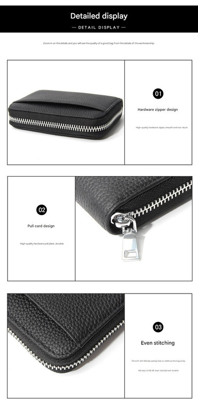 Secure your essentials in style with our Genuine Leather RFID Blocking Wallet. This compact yet spacious wallet is crafted from soft, top-layer cowhide with a sophisticated lychee grain texture and is designed to protect your personal information from electronic theft. The interior features an accordion-style design with multiple compartments for cards, cash, coins, and IDs, allowing for easy organization and access. The wallet’s through-bottom design can accommodate banknotes without folding. A high-quality metal zipper ensures your belongings are kept secure, while the uniform and durable stitching guarantees longevity. This wallet is the perfect blend of fashion, function, and security for your daily needs.