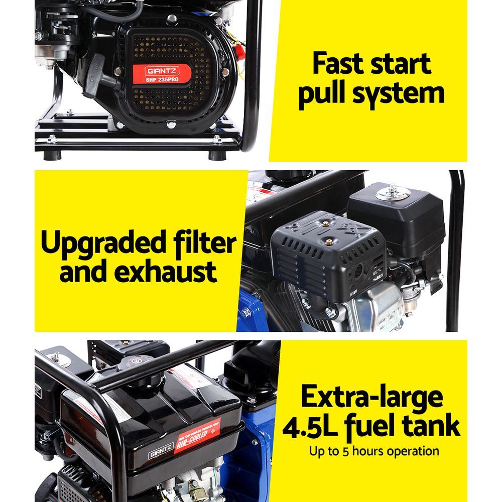The GIANTZ 8hp Petrol Water Pump provides outstanding performance for general water pumping applications. Whether it is for heavy-duty cleaning, irrigating the garden or pumping out a flooded cellar, you will be amazed with the versatility and performance our monster water pump. Featuring a 80mm (3”) inlet/outlet and a class-leading flow rate of 60,000L/h (1000L/min) , the hardworking water pump is coupled with a powerful 235cc, 3600rpm 4-stroke engine that easily transfers water up to four storeys high with minimum fuss. The motor assembly is housed in an anti-corrosive tubular steel frame. Better still, ceramic and carbon seals offer great durability and longlasting use. An extra-large 4.5L fuel tank means it can run for up to five hours on a single fill (load dependent). Not least, the water pump now complies with Euro 5 emission standards unlike others that are still on Euro 2. Simply better for you and the environment.