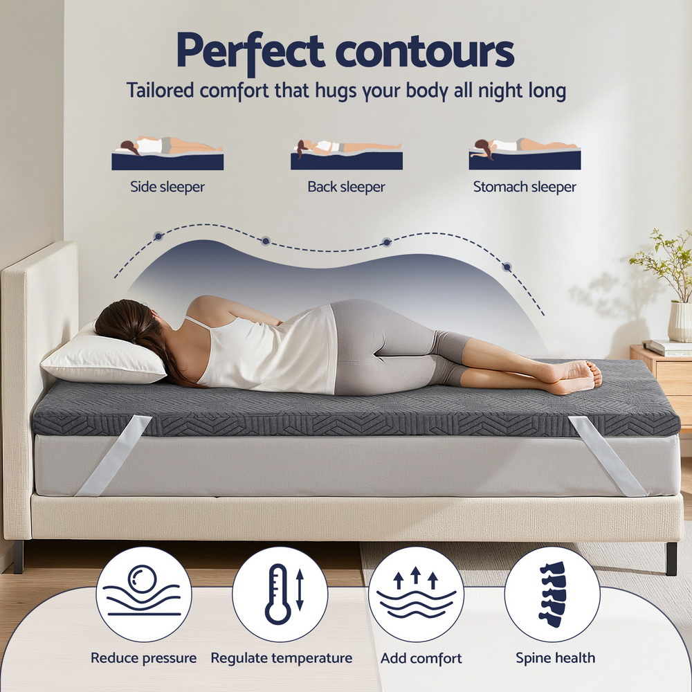 Experience restful sleep with this 8cm thick memory foam mattress topper from Giselle Bedding. Designed with dual-layer gel memory foam and a high-density base, it offers pressure relief and motion isolation. The bamboo cover is breathable, washable and secure.