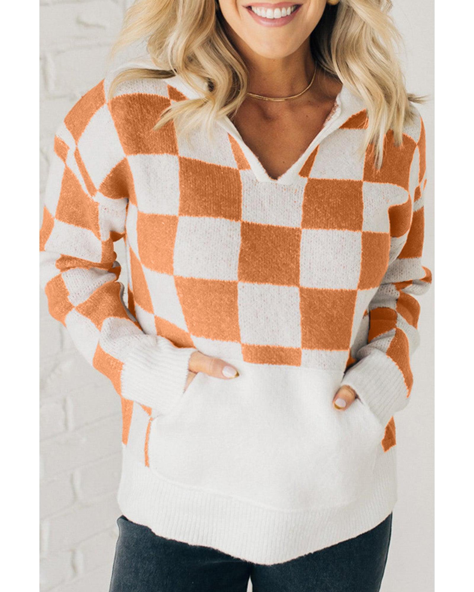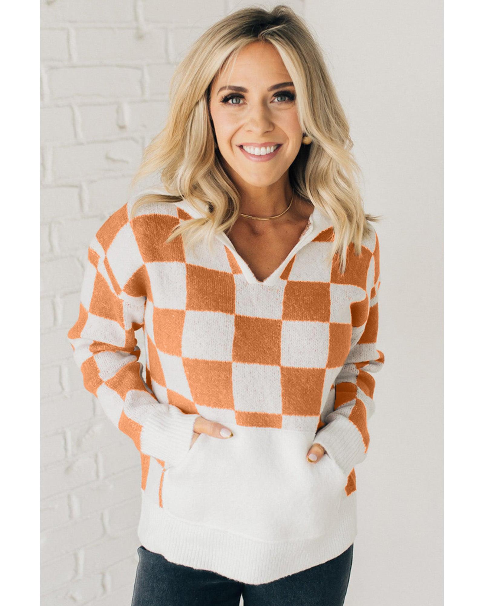 Gold Flame Checkered Split Neck Contrast Kangaroo Pocket Hooded Sweater – M
