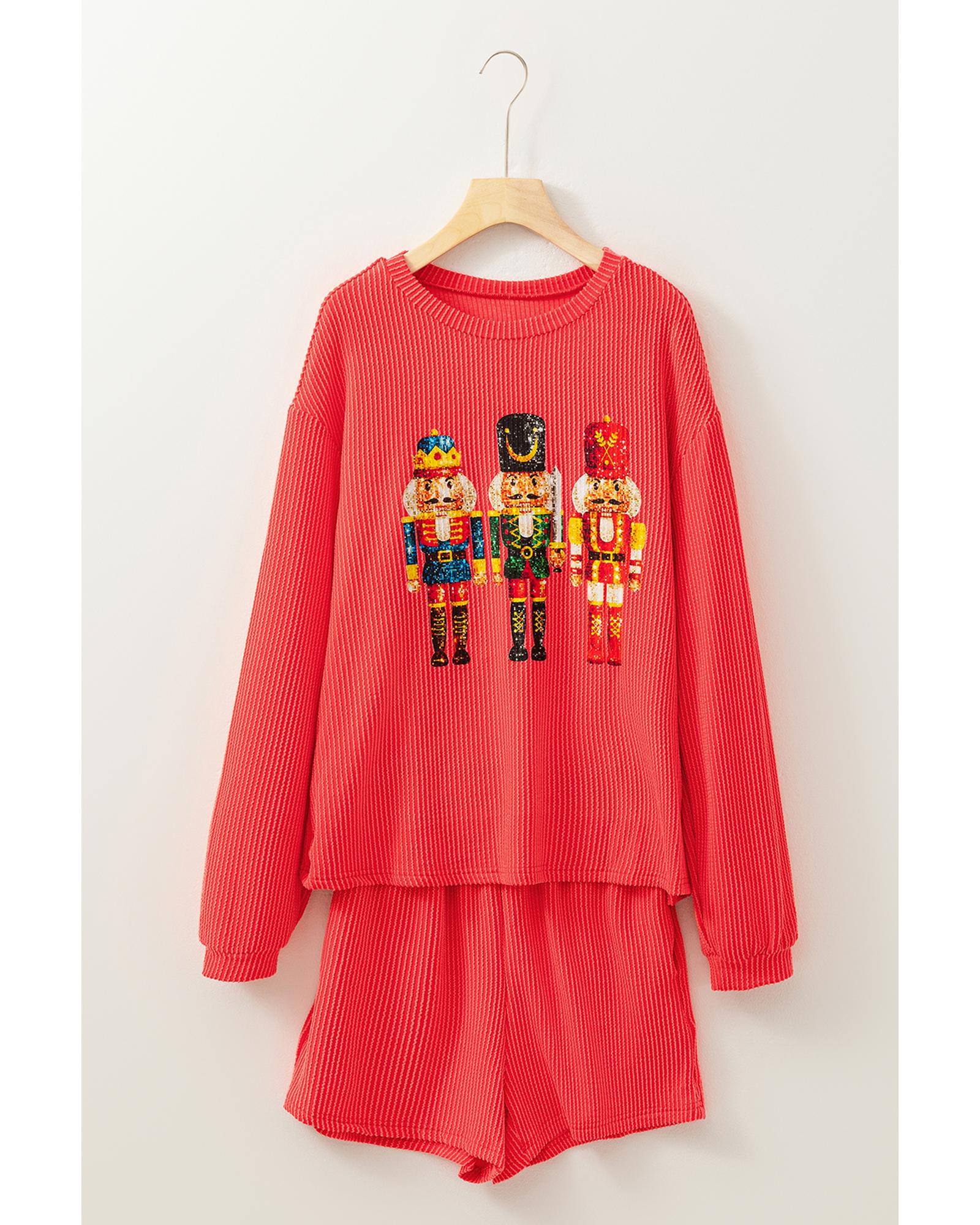 - Gold Flame Heat Transfer Christmas Nutcracker Ribbed Long Sleeve Top Shorts Set
