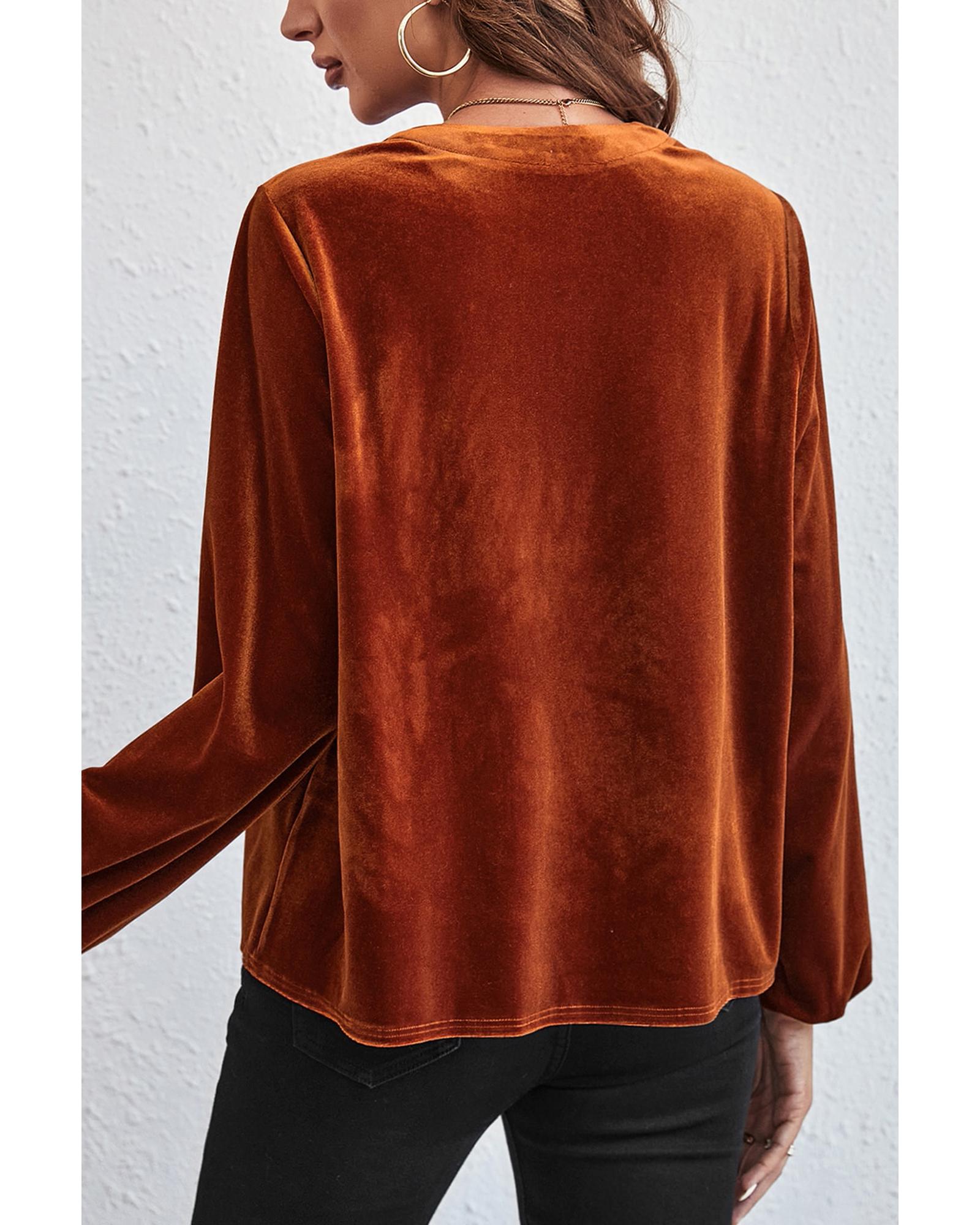 Gold Flame Lantern Sleeve Beaded Split V Neck Velvet Top – S