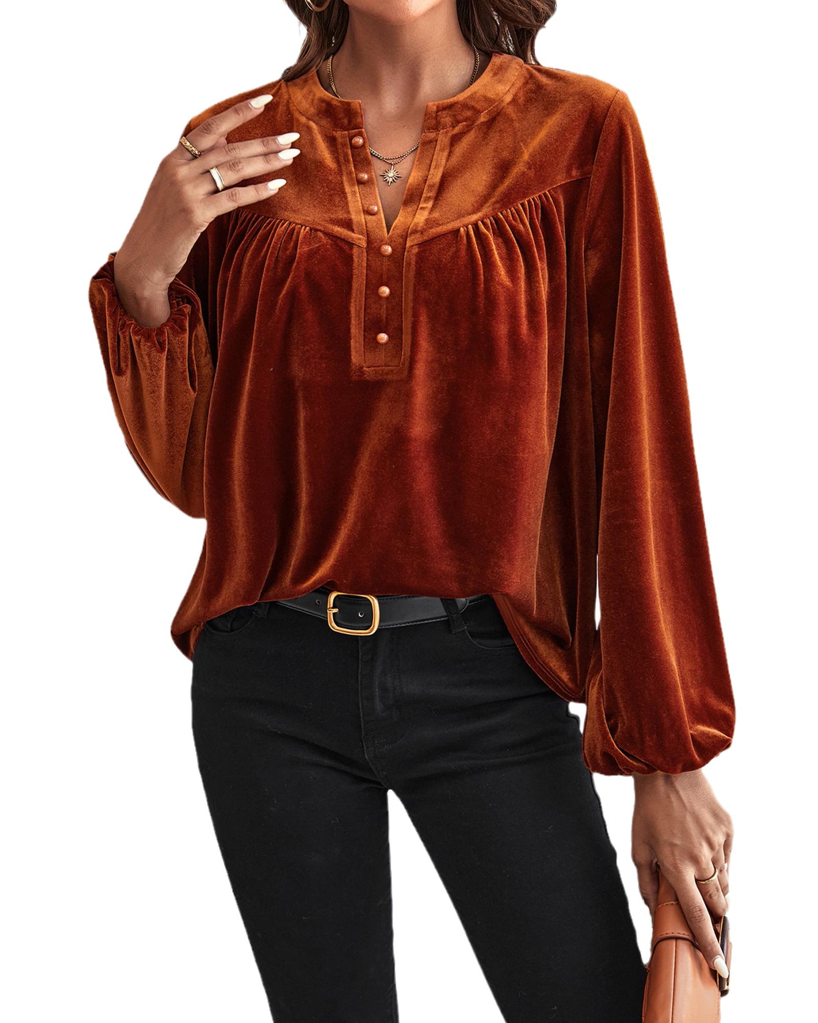 Gold Flame Lantern Sleeve Beaded Split V Neck Velvet Top – XL
