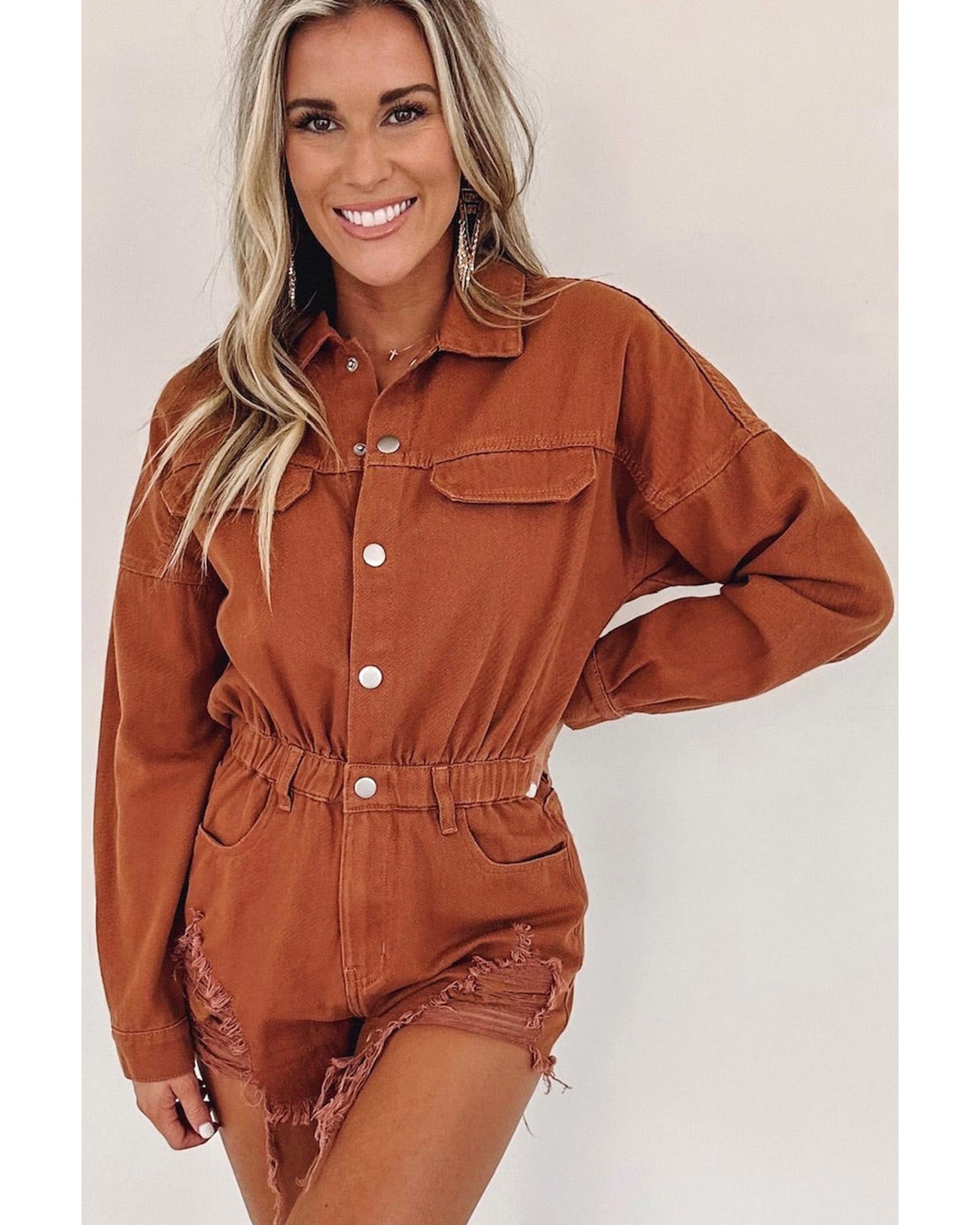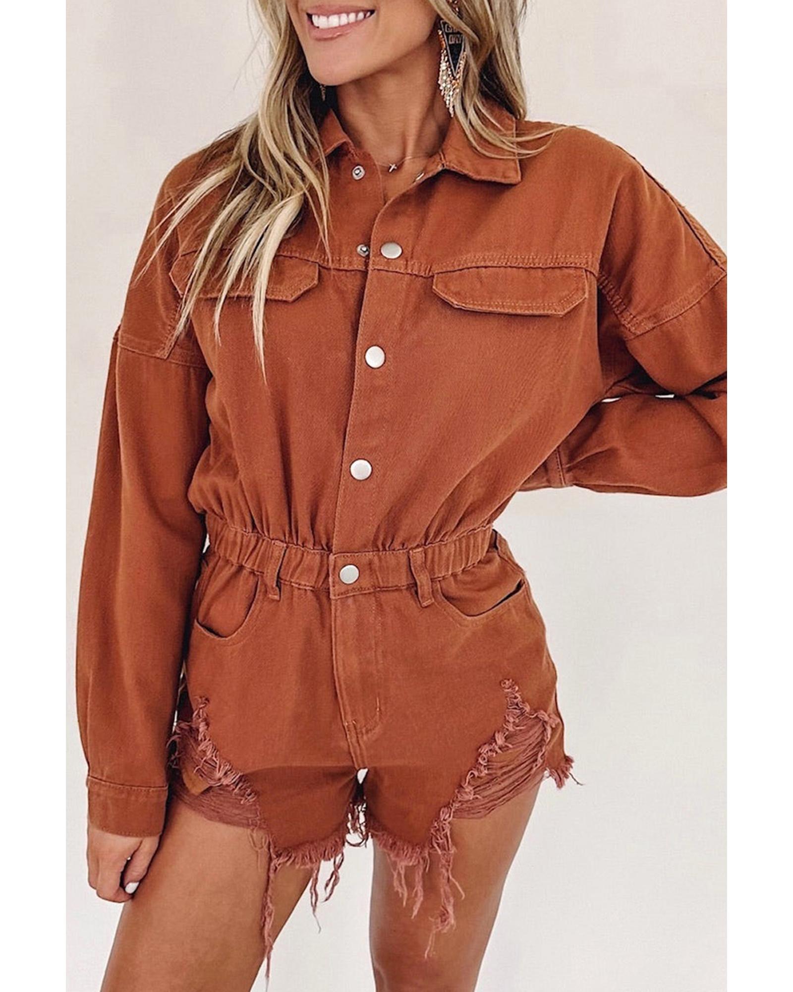 Gold Flame Long Sleeve Snap Buttons Distressed Denim Romper – XL