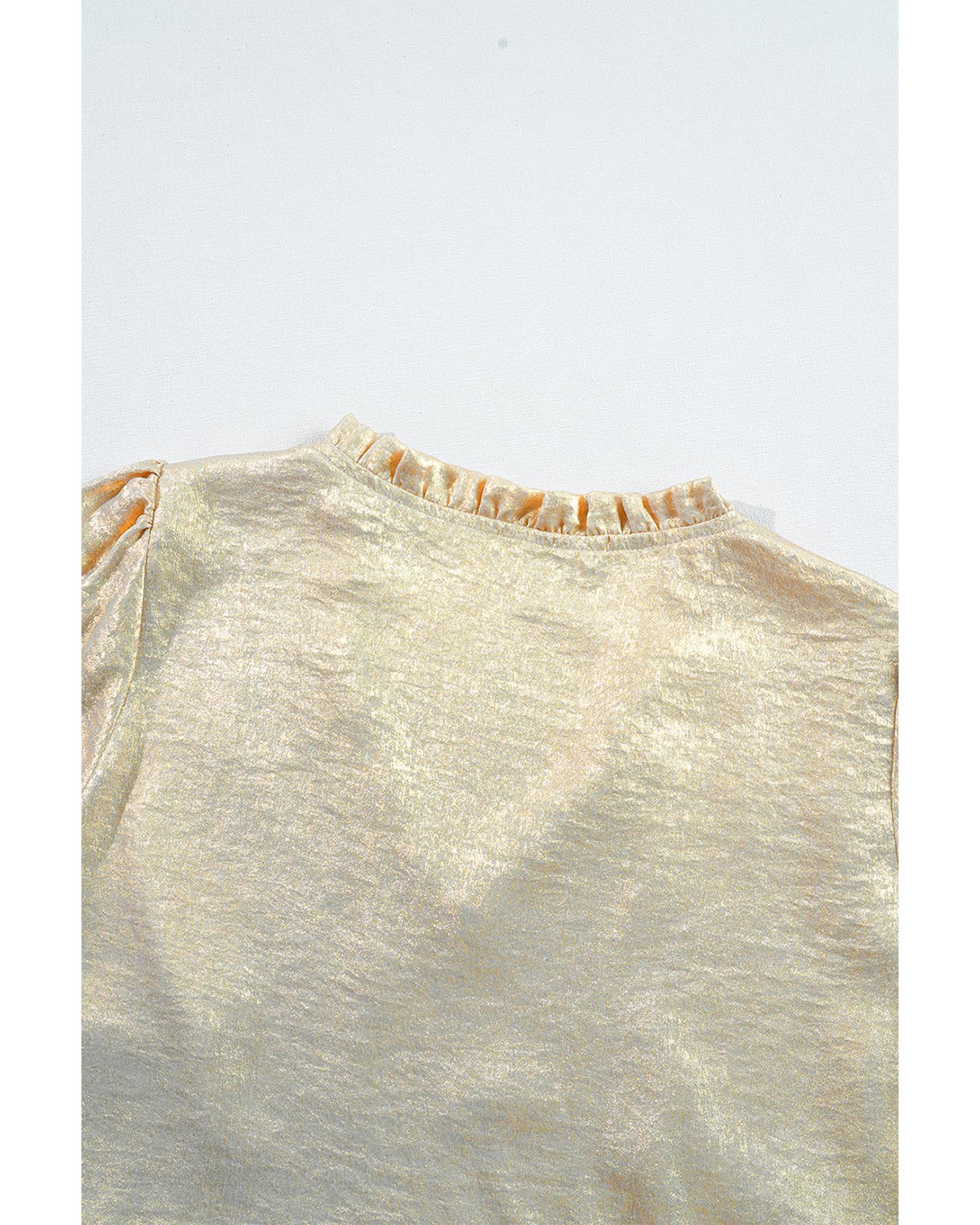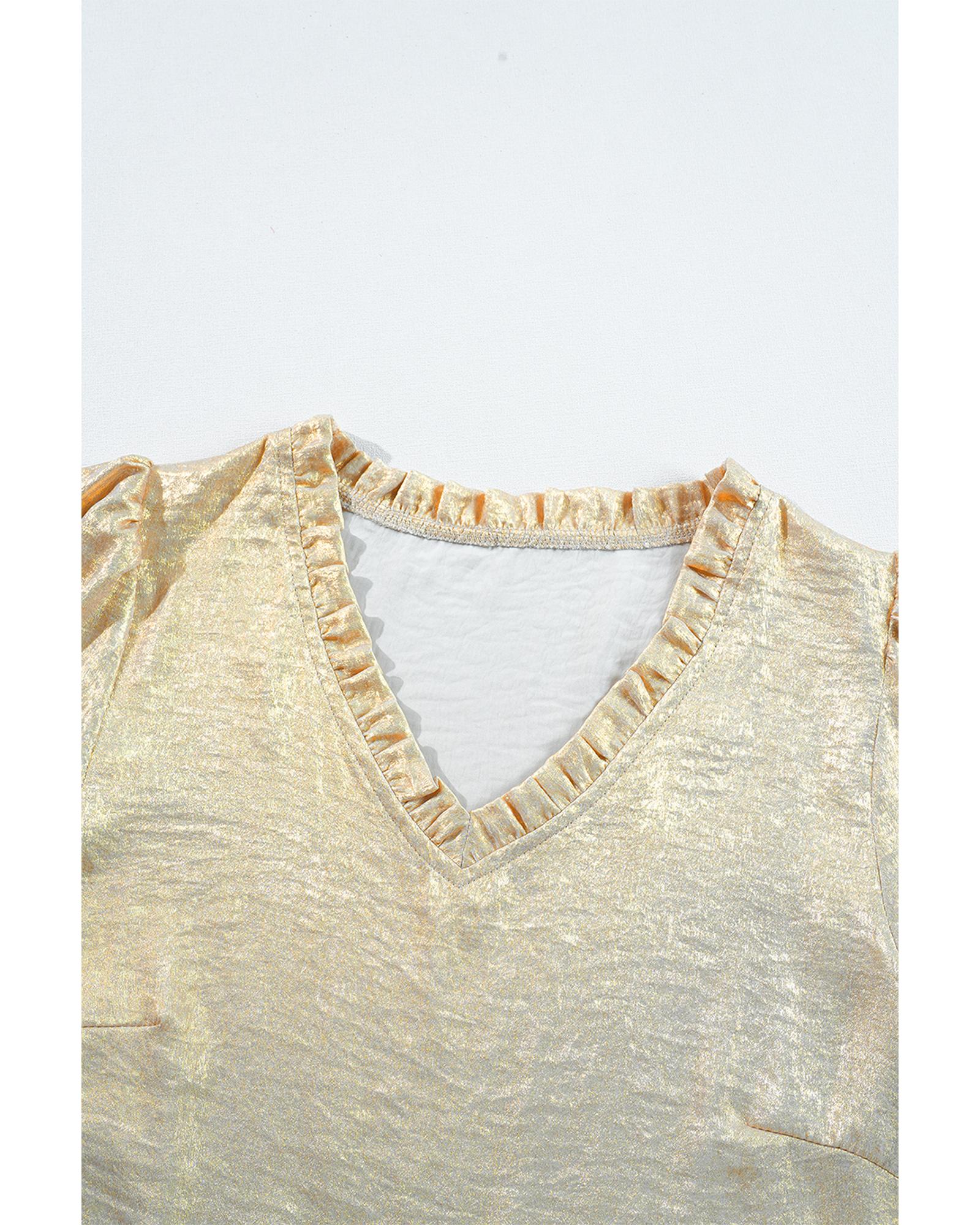 Gold Metallic Frilled V Neck Puff Sleeve Babydoll Blouse – XL